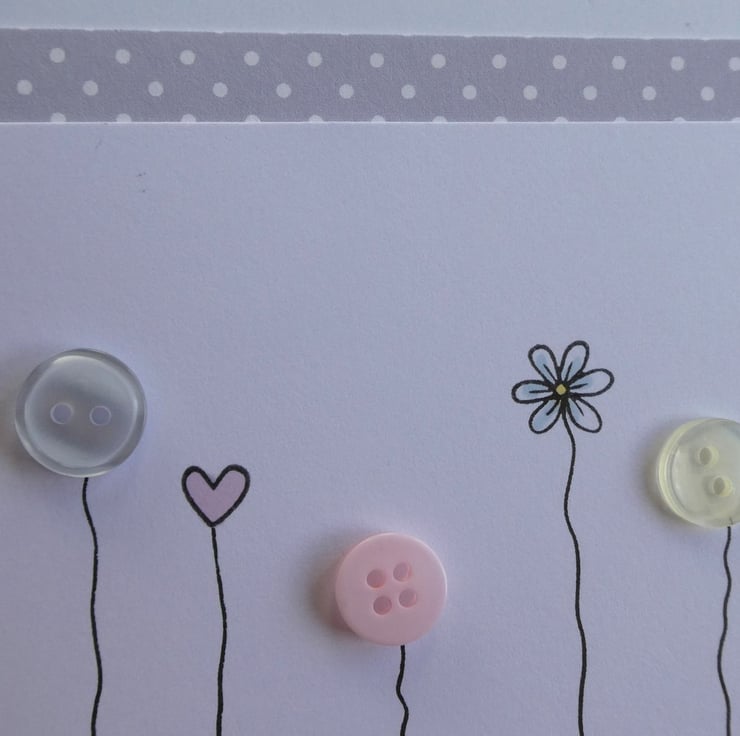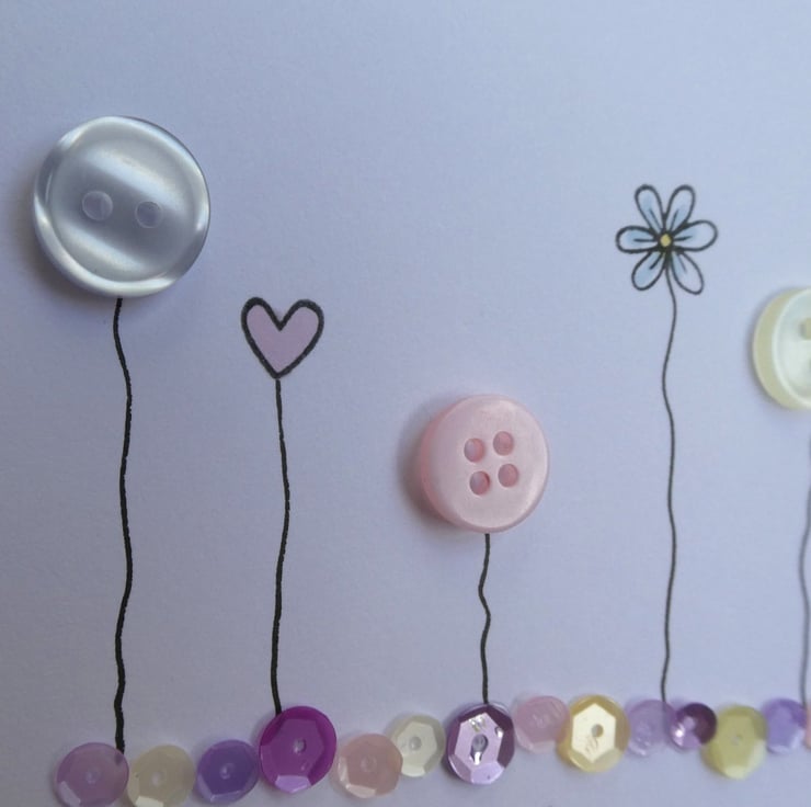 Three lilac buttons are mixed with a daisy and a pastel pink heart which have been hand stamped and inked. They have all been finished with hand drawn stems to connect them to a row of sequins in shades of pink, lilac, purple and white.