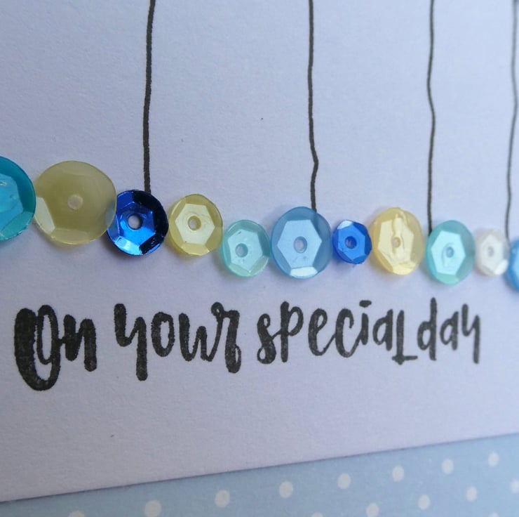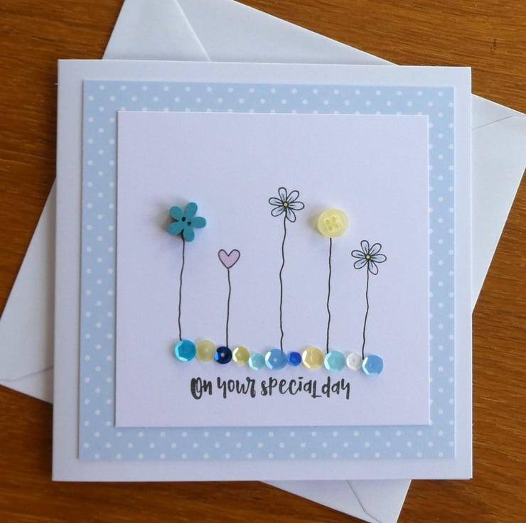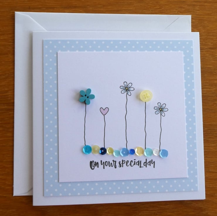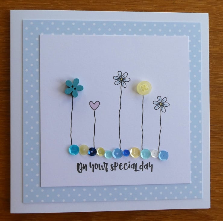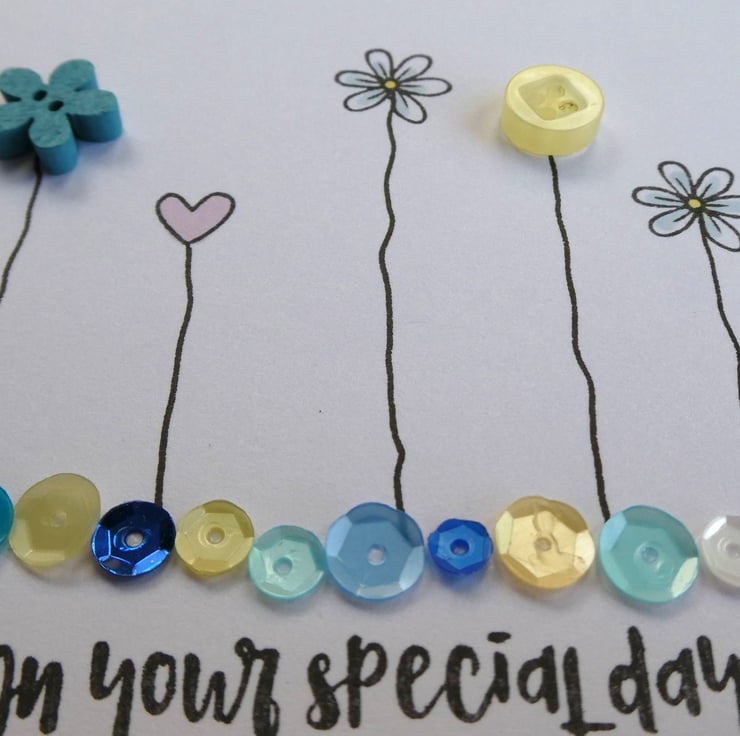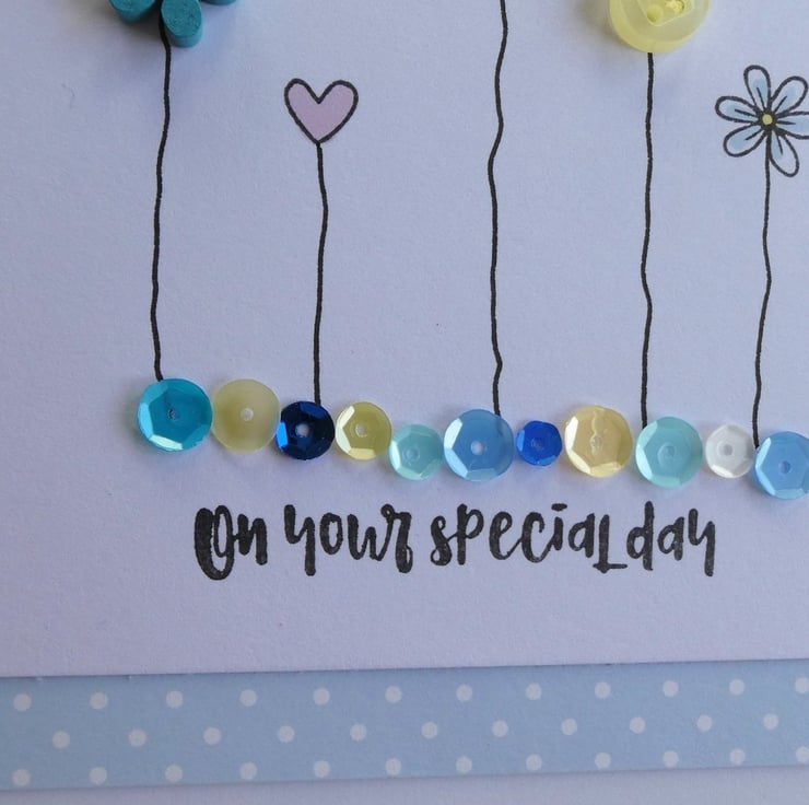 This pretty card has a row of buttons and hand stamped daisies and hearts, sitting above a line of sequins in shades of blue, aqua, yellow and white and the message On Your Special Day. It would be ideal to send as a Birthday card, Anniversary card or to celebrate any special occasion.