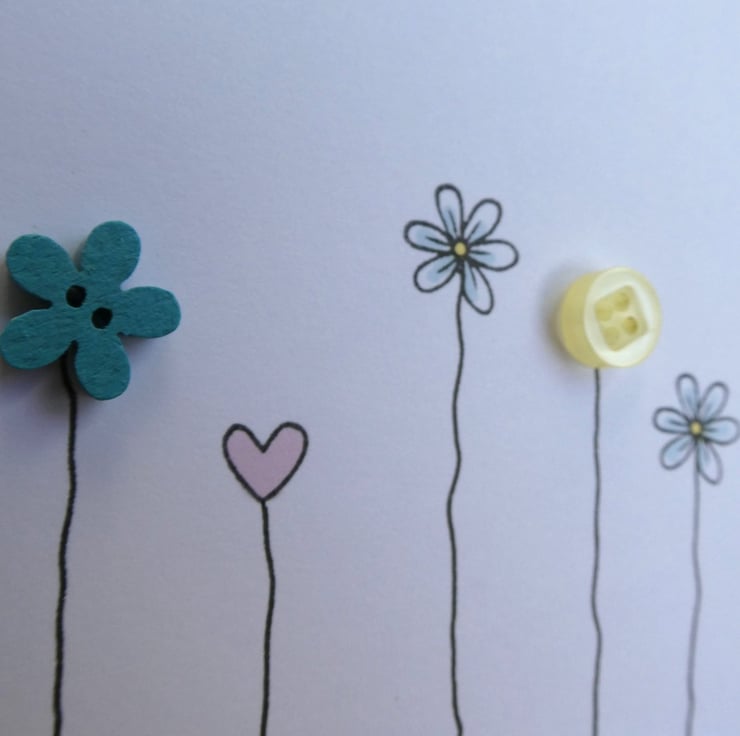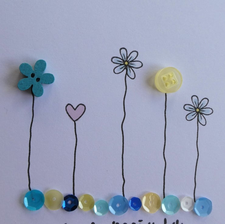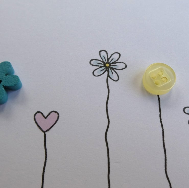 Two buttons, one a pale lemon and one a wooden flower shaped one stained a deep aqua colour have been mixed with daisies and a pastel pink heart which have been hand stamped and inked. They have all been finished with hand drawn stems to connect them to a row of sequins in shades of aqua, blue, yellow and white.