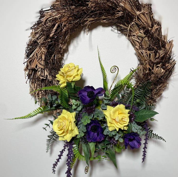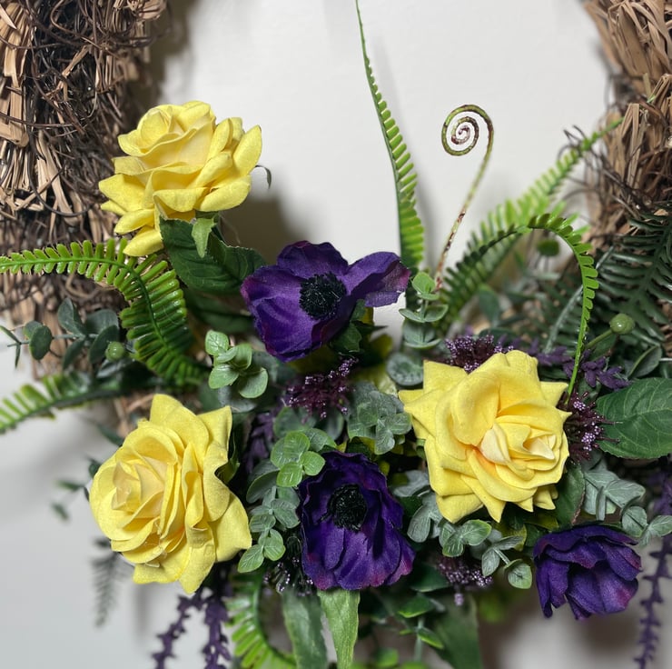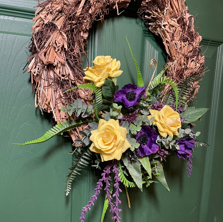 This rustic wreath is crafted on a natural twig base and decorated with vibrant yellow roses, deep purple flowers, and lush greenery. The bold colours create a beautiful contrast, making it a perfect statement piece for your front door or entryway.