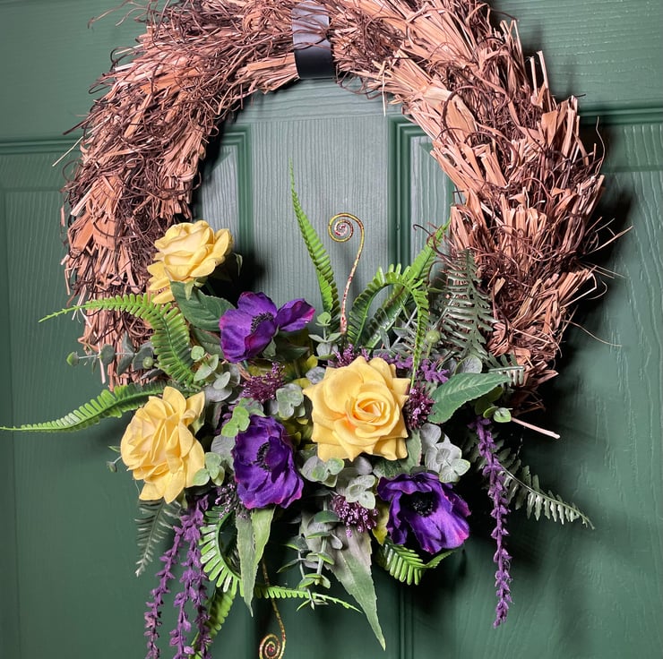 Spring Summer Wreath for Front Door UK, Yellow Rose & Purple Flower Wreath, Ru
