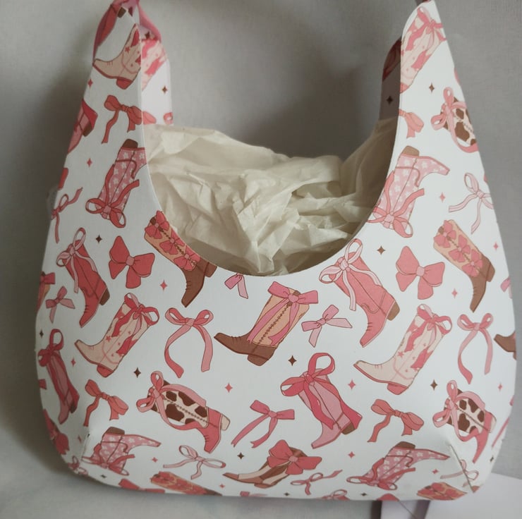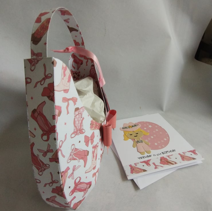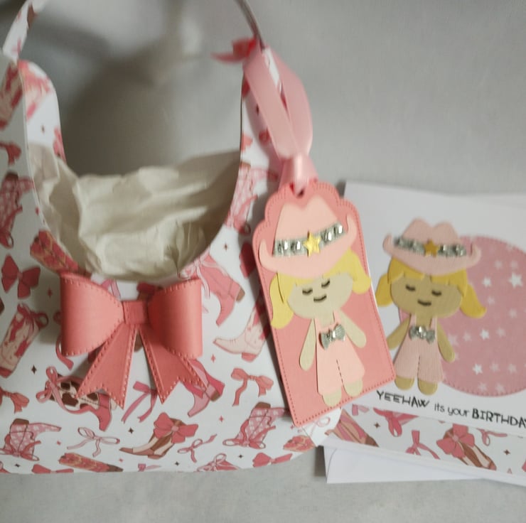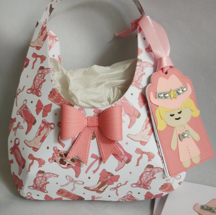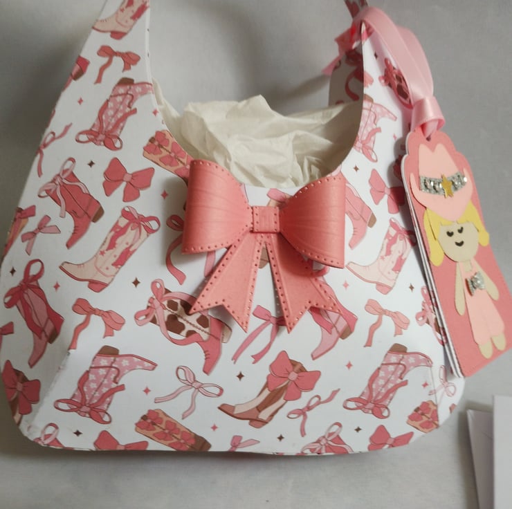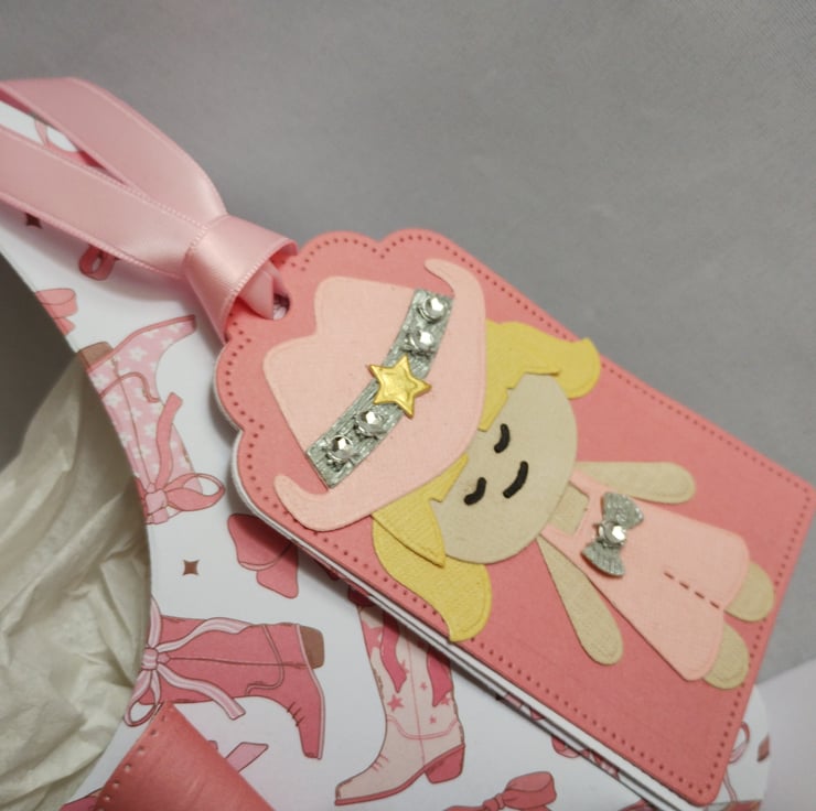 I've made the 'hobo' style gift bag from lightweight pink cowboy boot patterned cardstock and decorated with a pink cardstock bow. I've made gift tags featuring a cute cowgirl in a pink outfit with a diamante style gem studded cowboy hat.