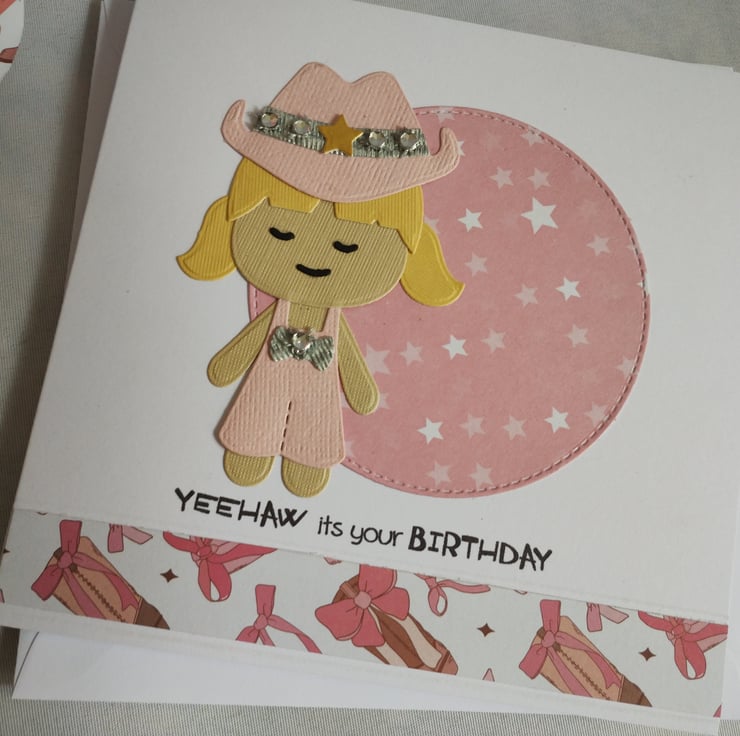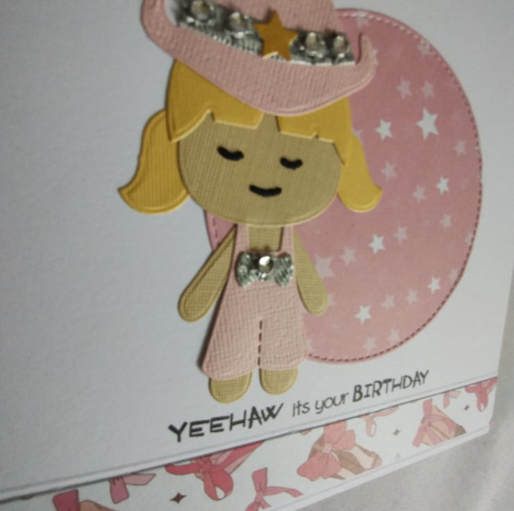 I've made the matching card and edged the bottom of the card with a strip of the cardstock to match the gift bag. I've made another cute cowgirl and added a cut stitched circle of pink star patterned paper. The sentiment reads ' Yeehaw its your Birthday'. The inside is left blank for your message.