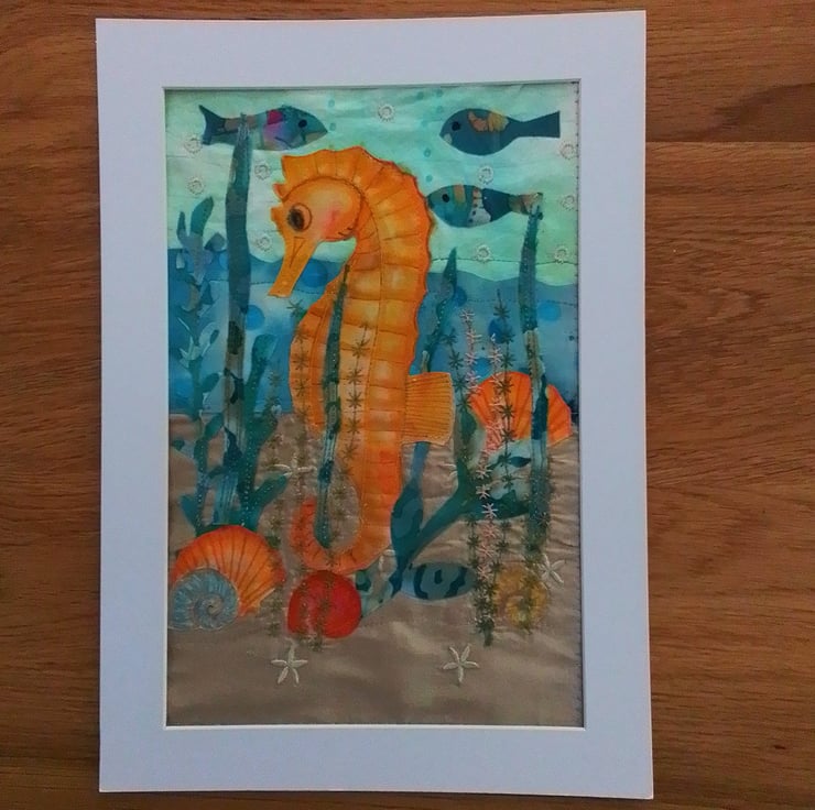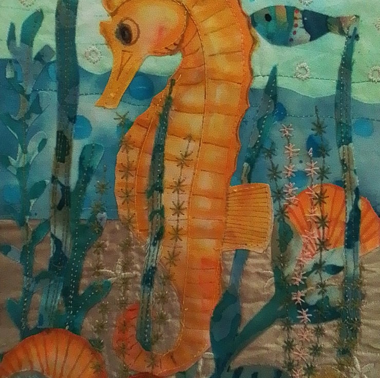 The seahorse was hand drawn and coloured, cut out and applied to the background.