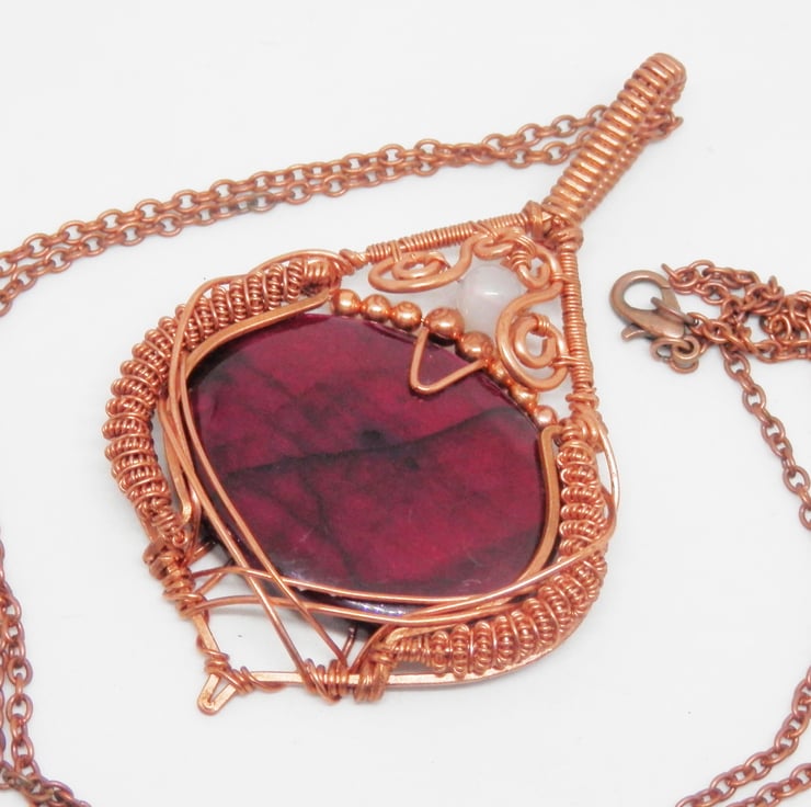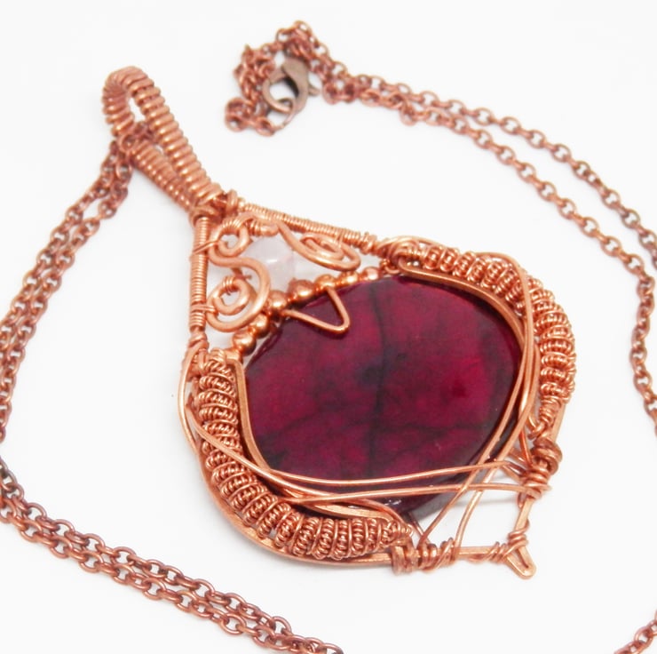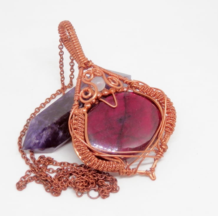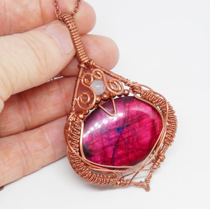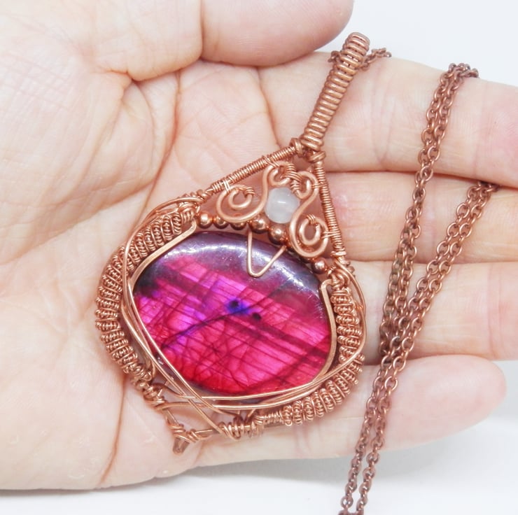 Here we have a stunning statement piece wire wrapped Necklace, made using copper wire that has been wrapped lovingly in an Elven style around an oval shaped piece of red dyed Labradorite that flashes in the light. There is plenty of elaborate coiling and swirls added to adorn this beautiful piece.