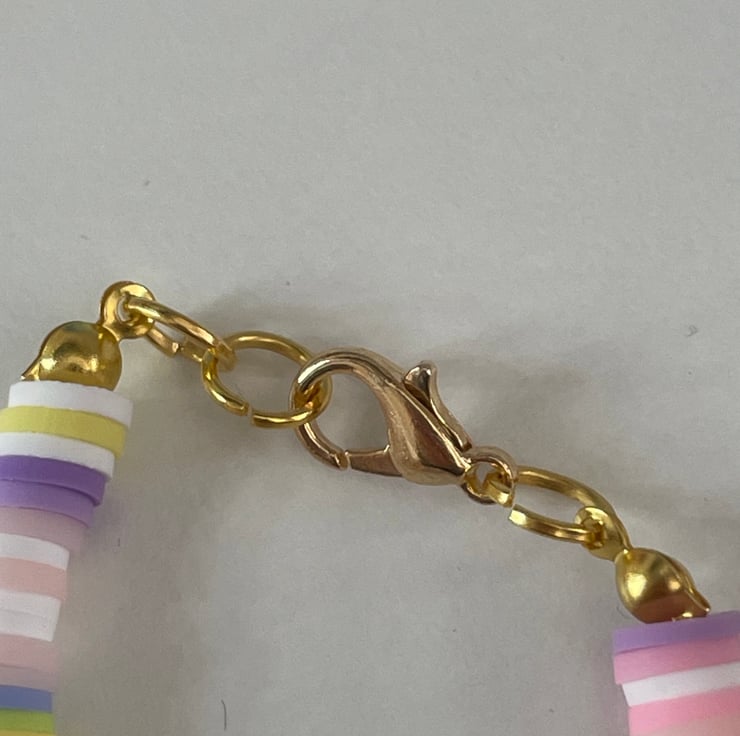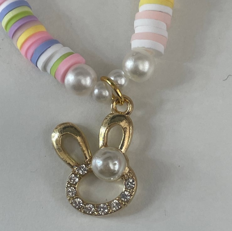 A pastel Easter themed clay bead bracelet perfect for any small gift made with love! This handmade bracelet is made out of clay in Great Britain and it has pearls and an Easter bunny charm to add a pop of colour to any outfit on easter!!