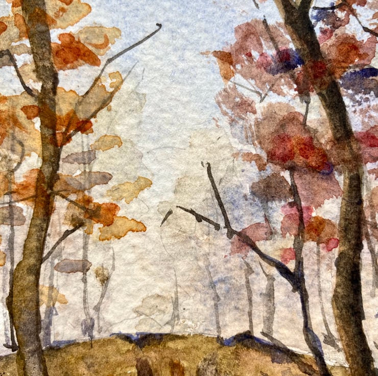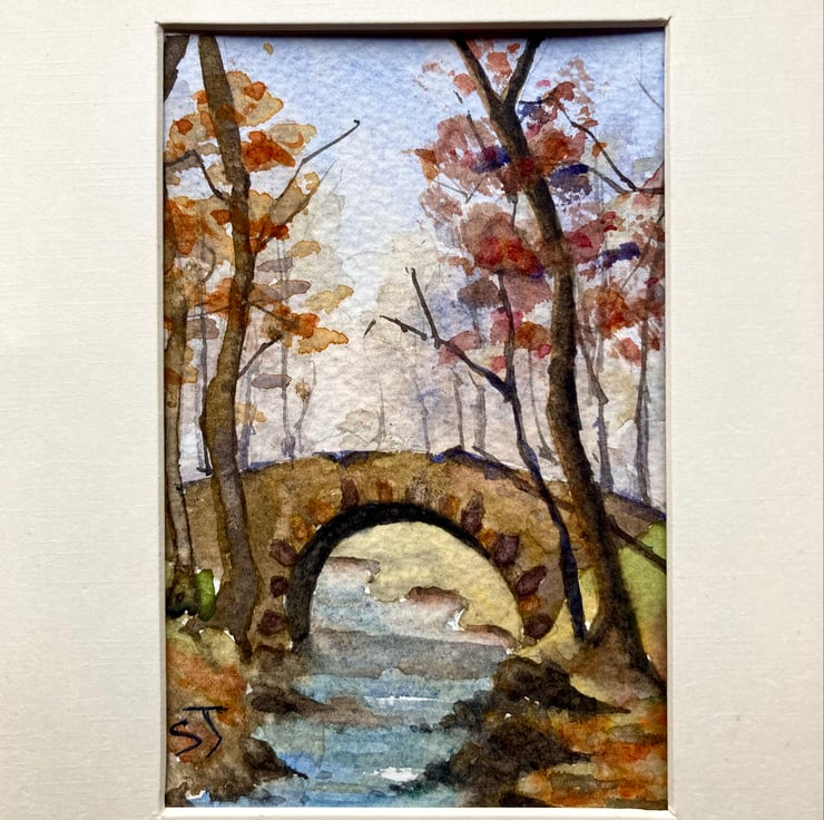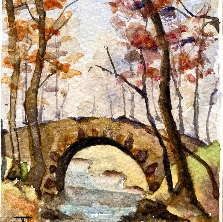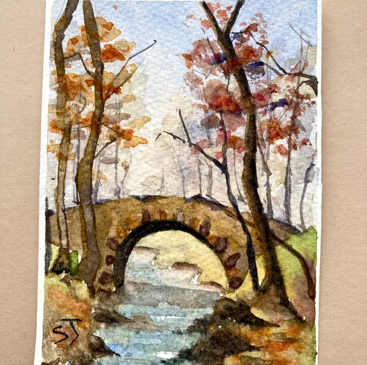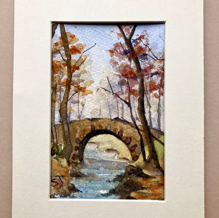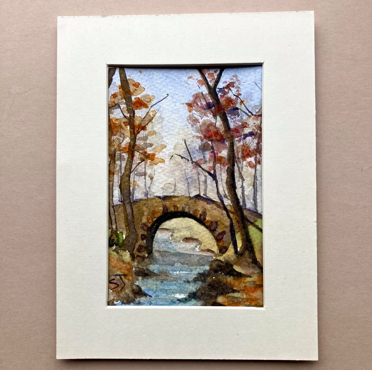 Mini Watercolour wall decor of stone bridge in woodlands, England. I love the colours in this small collectible piece. For some reason I like mixing earthy colours and have a few watercolours with this warm pallet.