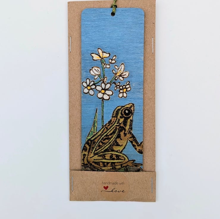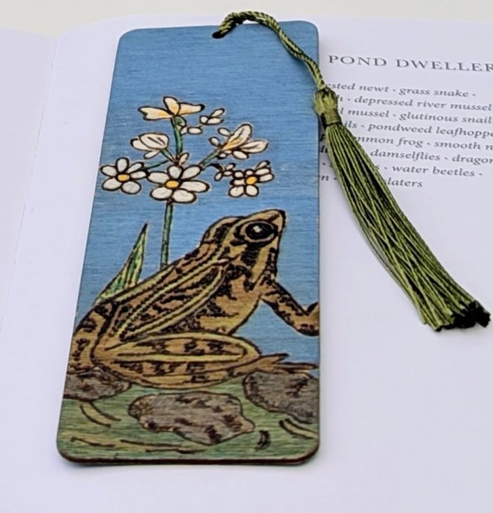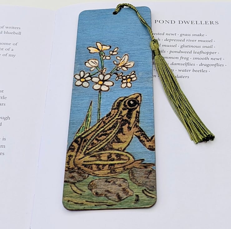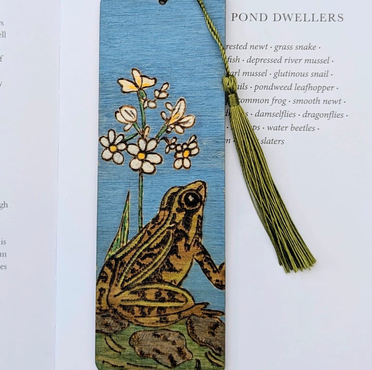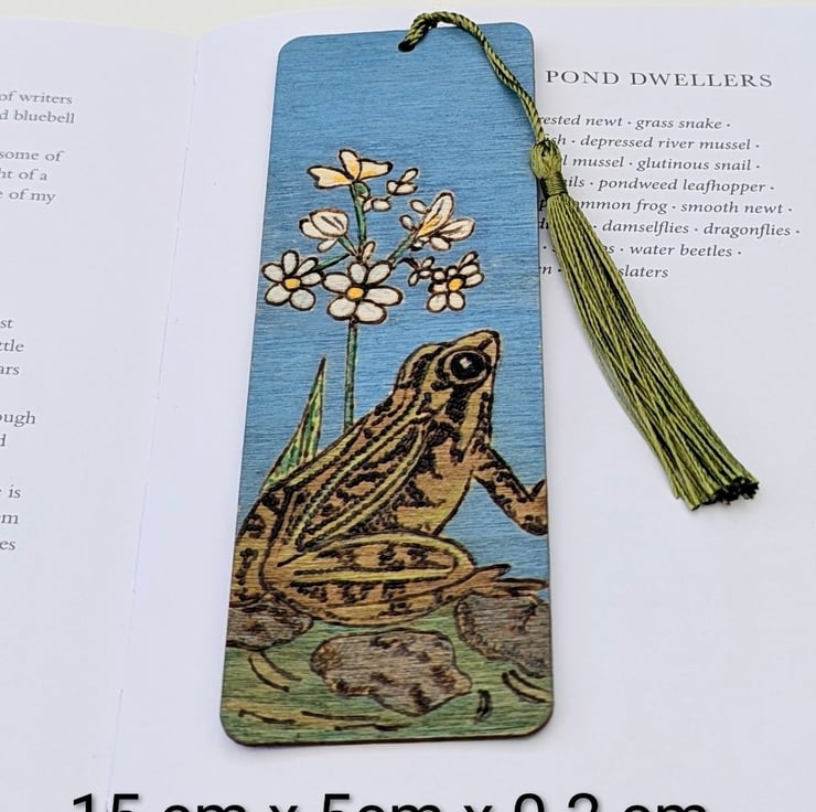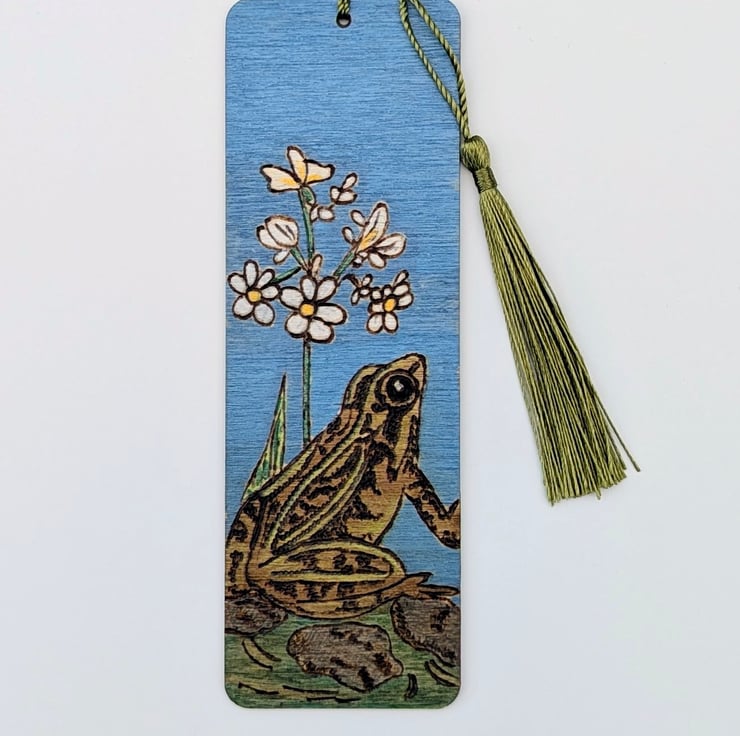 Lovely wooden bookmark featuring a frog in a pond which has been lovingly hand burnt using the art of pyrography and coloured with acrylic paints. The bookmark has been given several coats of varnish and finished with a green tassel. Inspired by my little wildlife pond which is full of frogs in the summer months and I love to sit on my bench with a cup of coffee and watch them.