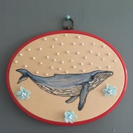 Free hand sewing machine embroidery VW beetle, mix of threads and paper and framed in 12inch flexi hoop, created on cotton coffee stained fabric.