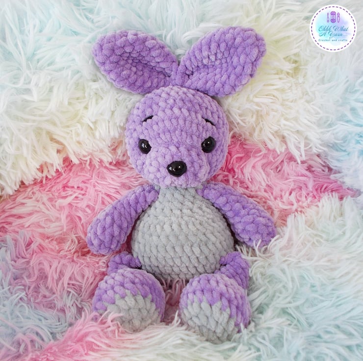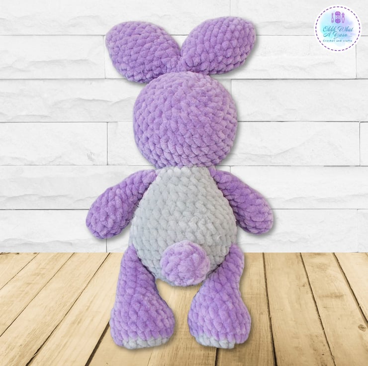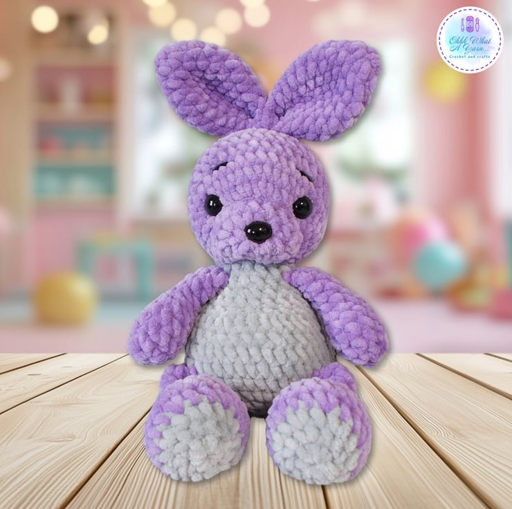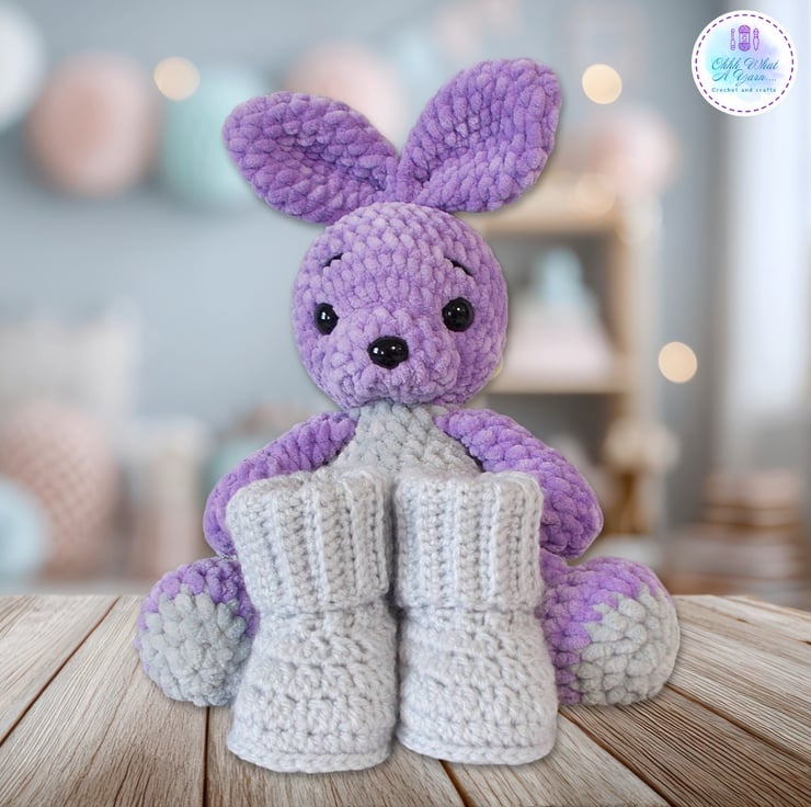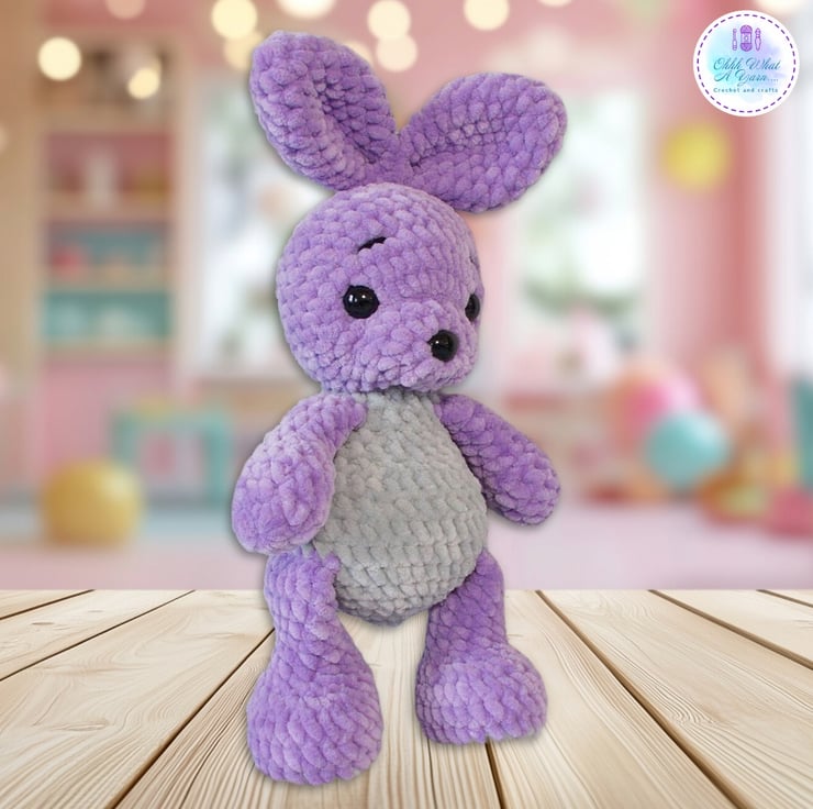A tiny treasure for your tiny treasures, this cute bunny has been crocheted with gorgeous 100% polyester snuggly chenille yarns in lovely shades of lilac and grey
