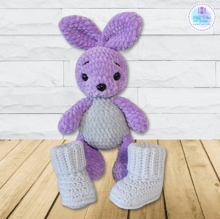Bunny would make a perfect new baby gift, and I have made some optional matching age 0-3 months ribbed cuff boots. The boots are crocheted with acrylic yarn and are hand or machine washable at 30 degrees, do not tumble dry. (See drop down menu for purchase options)