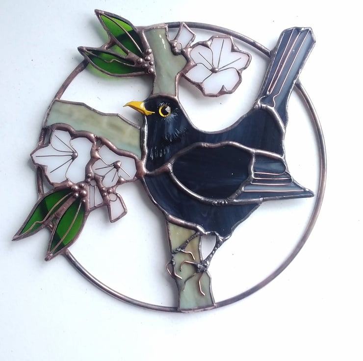 Hand-crafted from a selection of of the highest quality stained art glass, this 6" copper ring design combines modern decorative soft solderwork with the traditional Tiffany copper foil technique, to create a totally unique, contemporary stained glass panel: Black and grey wispy opal glass is accentuated with delicately hand-painted enamel and wirework details including a bright yellow cabochon eye to add character and life. Offset with glossy Uro Sky blue and brown branches, Wissmach seville apple green leaves and delicate Oceanside Pearl white blossoms to complete the composition.