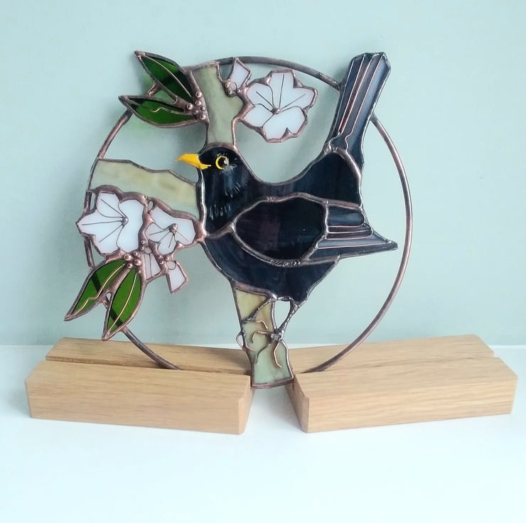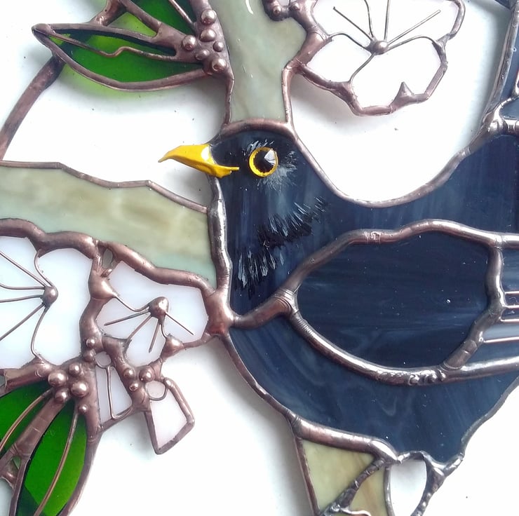 Medium stained glass ring depicting one of the UK's favourite songbirds, the blackbird. Set amongst abundant clusters of white blossom and offset with copper details.