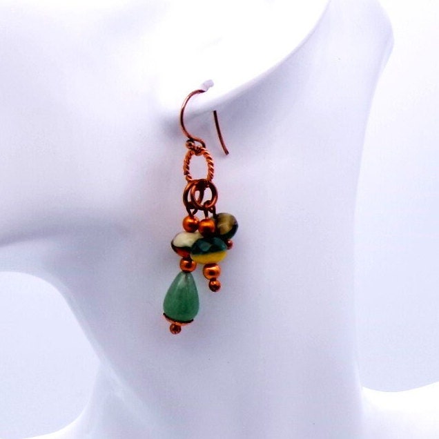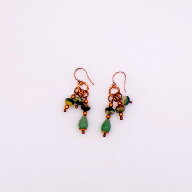 Copper Czech Glass And Green Aventurine Dangle Earrings- Copper Earwires