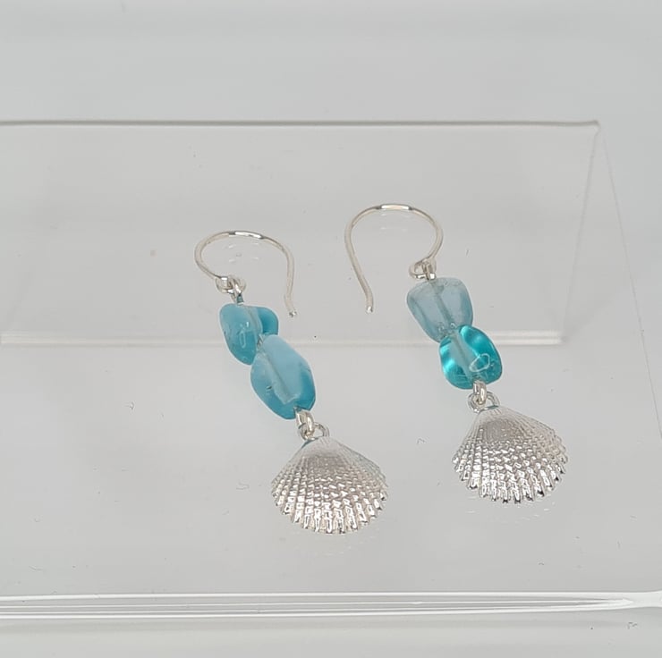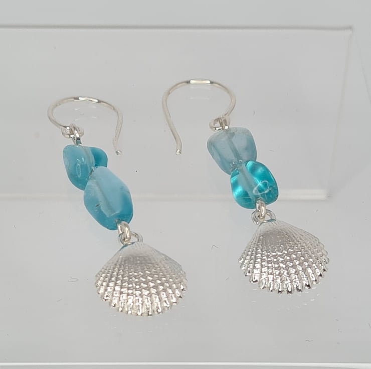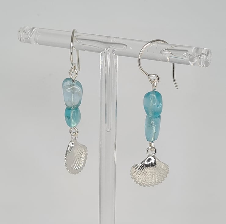Handmade Sterling Silver With Apatite Gemstone Dangle Earrings. Two Sea Blue Apatite Gemstone Nuggets On 22 Gauge Sterling Silver Wire. Beneath Is A Sterling 14mmx12mm Silver Sea Shell And All Are Hanging Beneath Handmade 22 Gauge 0.8mm Sterling Silver Ear Wires. The Earrings Are 33mm Long From The Bottom Of The Hooks.