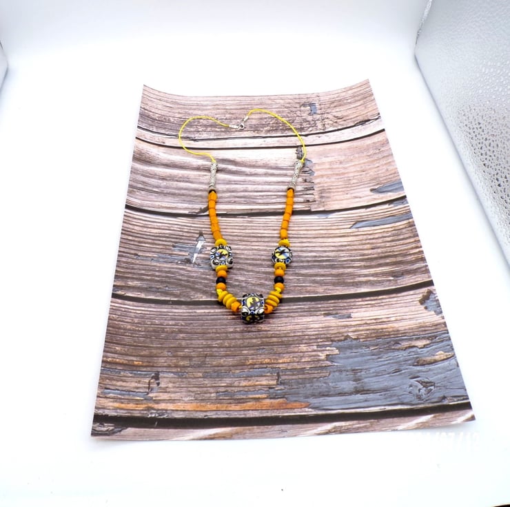 Yellow Hemp Necklace- Wooden And Tibetan Silver Beads- 19 Inch Hemp Cord Necklace- Handmade Hand Painted Ceramic Beads With Surfer Girl