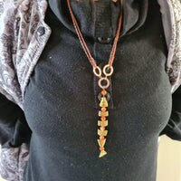 Worry Fish Necklace. Y Necklace With A Gold Segmented Worry Fish Separated By 8mm Fire Crackle Agate Beads. The Fish Hangs On Brown Waxed Leather And Leads to Hand-Embossed Copper Washers. The Necklace Is 24 Inches Long And Is Made From Hand Tied Brown Suede And Copper Chain Secured With A Lobster Clasp. A Unique Handcrafted Necklace.