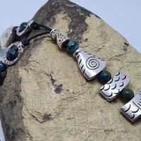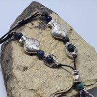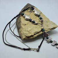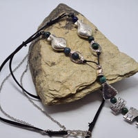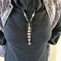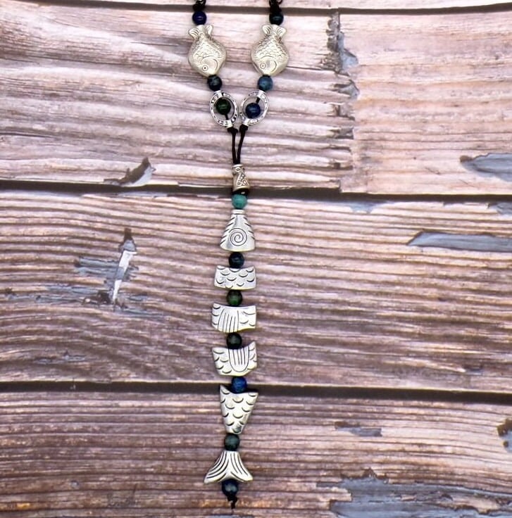 Silver Worry Fish Y Necklace. Hand Knotted Black Suede Necklace With Silver Plated Chains. Segmented Silver Alloy Fish Which Is 12cm Long. Each Segment Of The Fish Is Separated By 6mm Natural Azurite Grade 'A' Semi-Precious Gemstones And Hangs On Waxed Leather Cord. The Necklace Then Splits into a Y shape With Each Strand Adorned With Smaller Silver Alloy Fish And Framed Azurite Gemstones. The Necklace Is 24 Inches Long And Secured With A Lobster Clasp. A Unique Handcrafted Necklace.