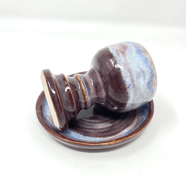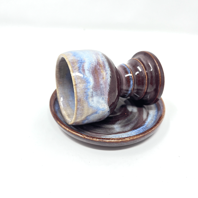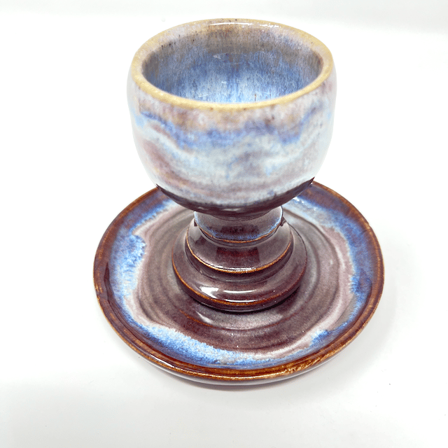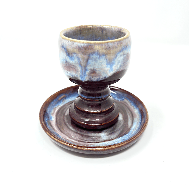 Small yet beautifully expressive, this handcrafted communion set features a softly cascading glaze in tones of pearl pinks and mauves cascading into deep plum on the stem.