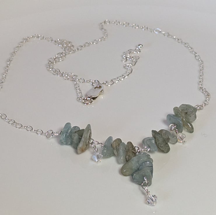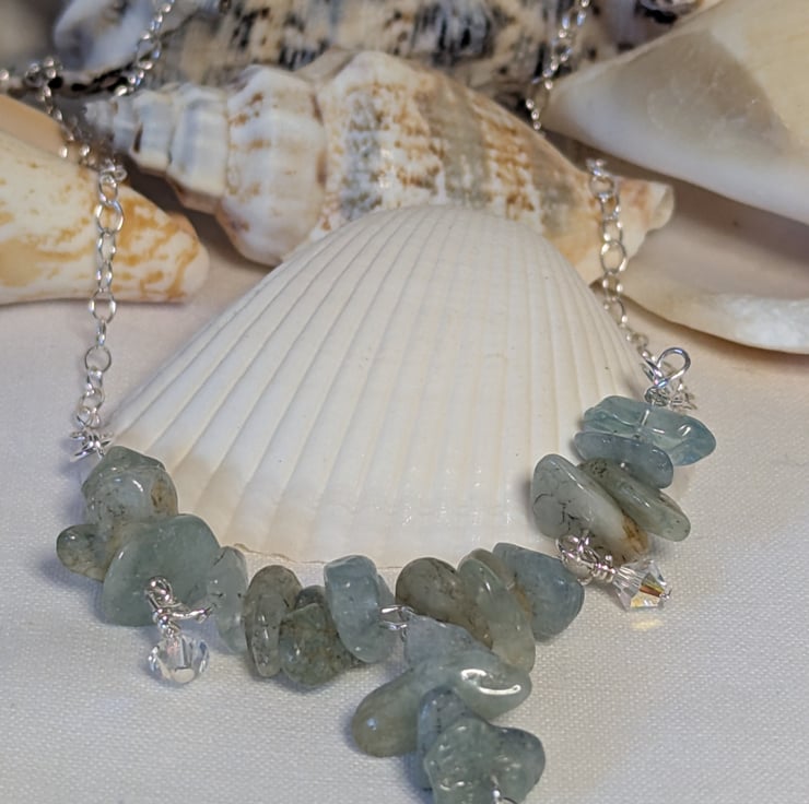 This beautiful necklace is made from Aquamarine chip bead links adorned with Swarovski crystals. The chain and findings are all Sterling Silver.