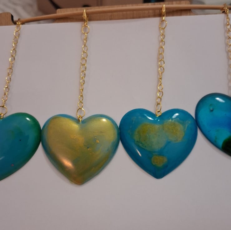 Handmade epoxy resin heart shaped keyring, 4 x blue, green, gold variations