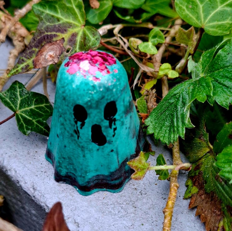 Add a touch of eerie charm to your space with these spooky-cute mini ghost figurines. Each piece is handcrafted from eco-resin and finished with a shimmering, glittery top—giving the illusion of a sparkly "zombie brain" peeking through. Equal parts creepy and adorable, these little spirits are perfect for anyone who loves alternative décor with a playful twist.