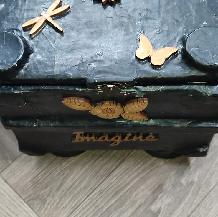 This box did begin life as a cat food box and with 12 hrs and lots of laying of junk mail its now a lovely little positive thinking storage box of goodies , ideal for a unique gift there is no other goody box like this out there.