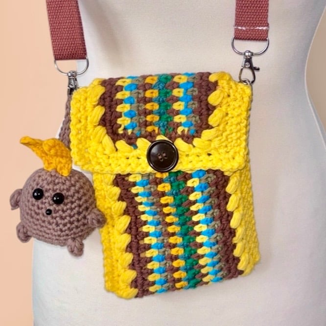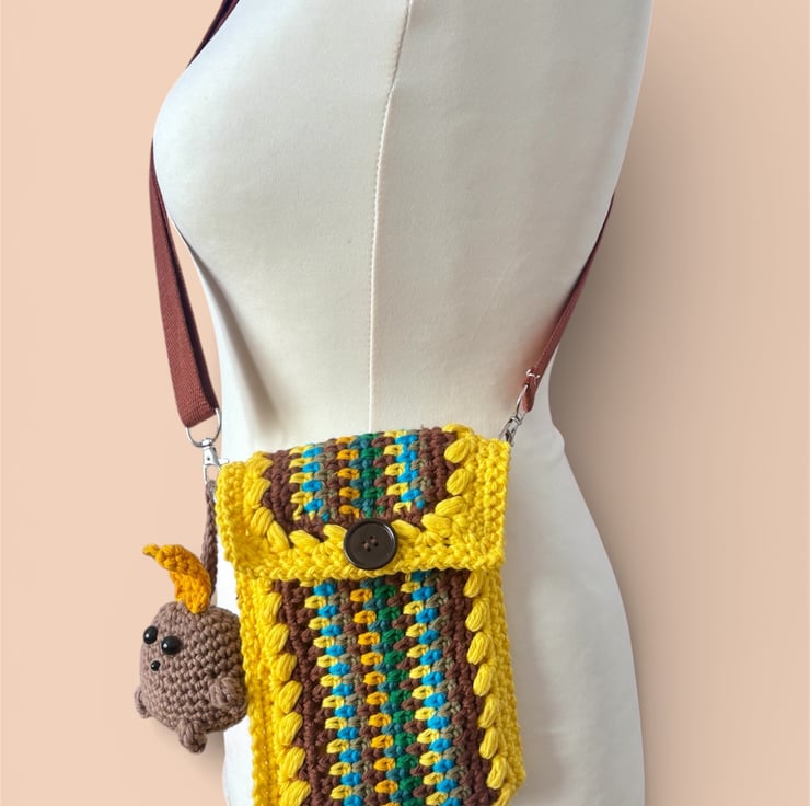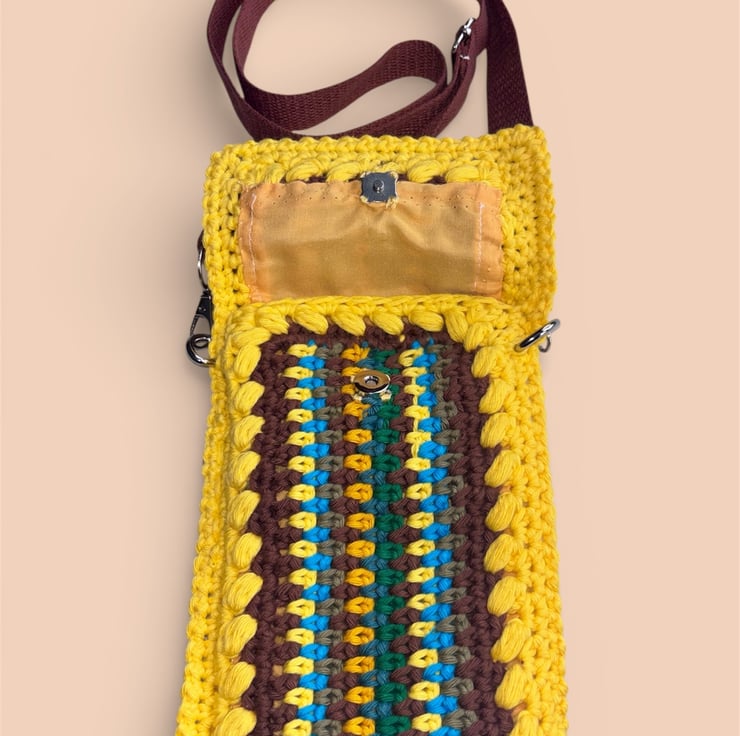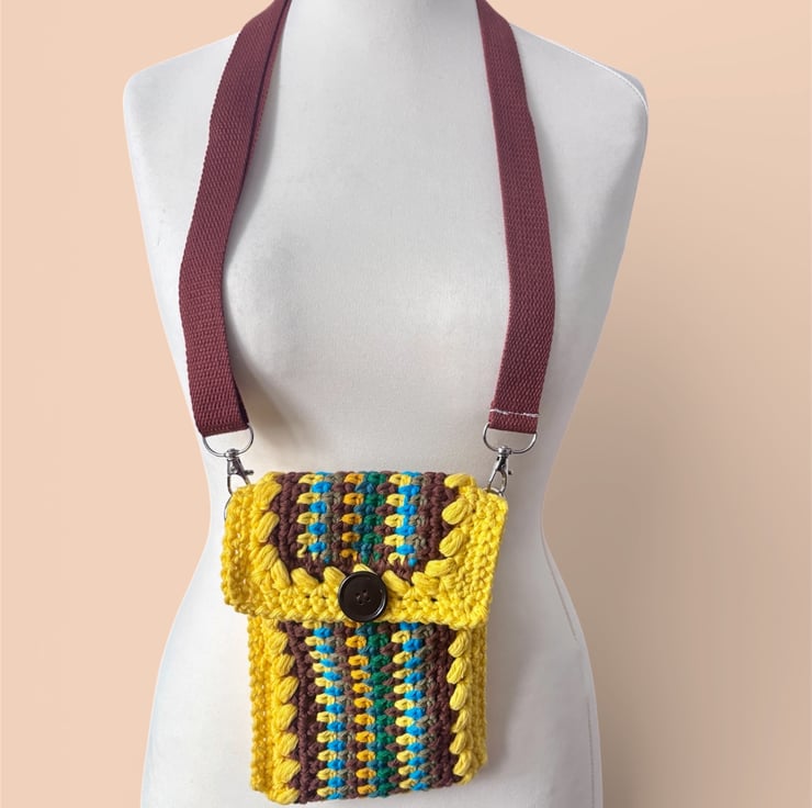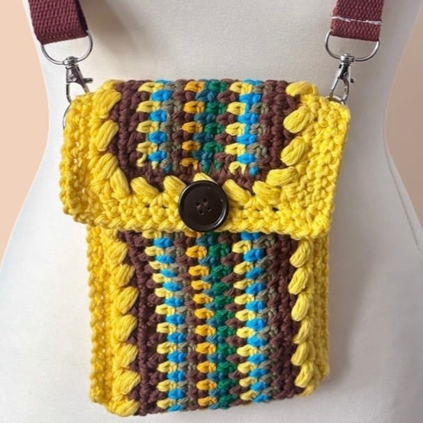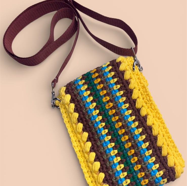 Brighten up your daily essentials with this beautifully handmade crochet crossbody bag. Designed as a stylish vertical phone bag, it features a vibrant, multi-coloured palette of yellow, brown, blue, teal, and mustard—perfect for adding a pop of colour to any outfit.