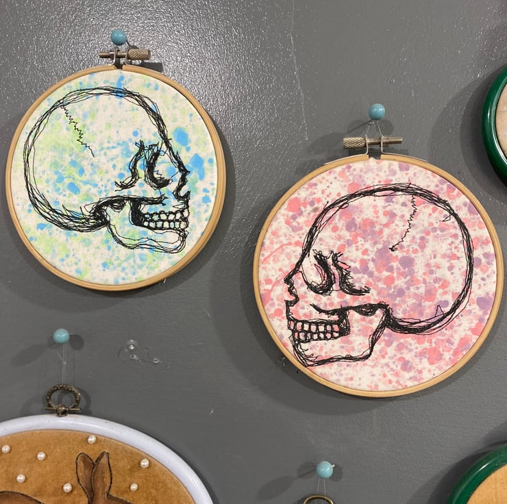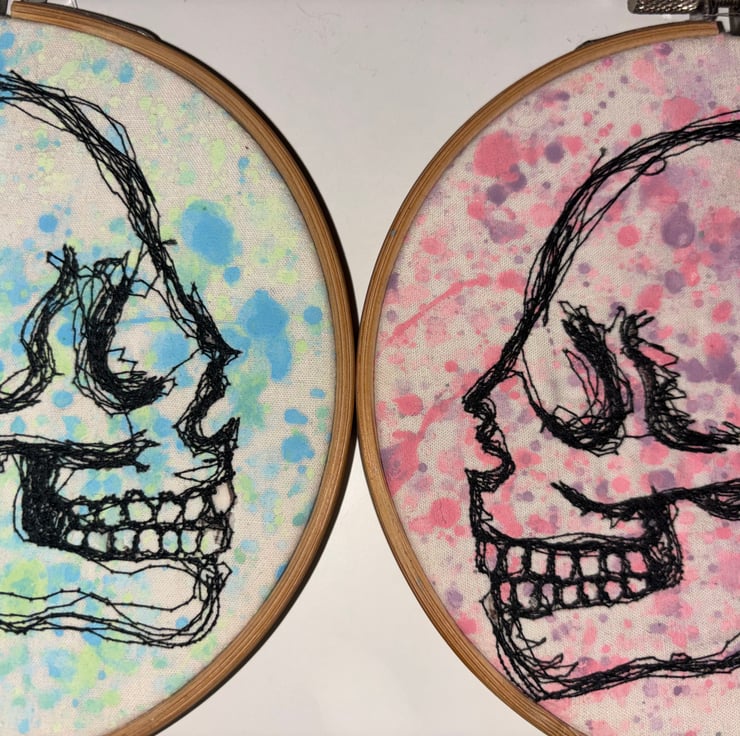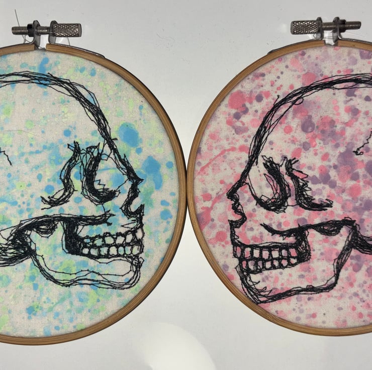 Cotton Fabric coloured using fabric paint with free hand machine embroidered skulls.