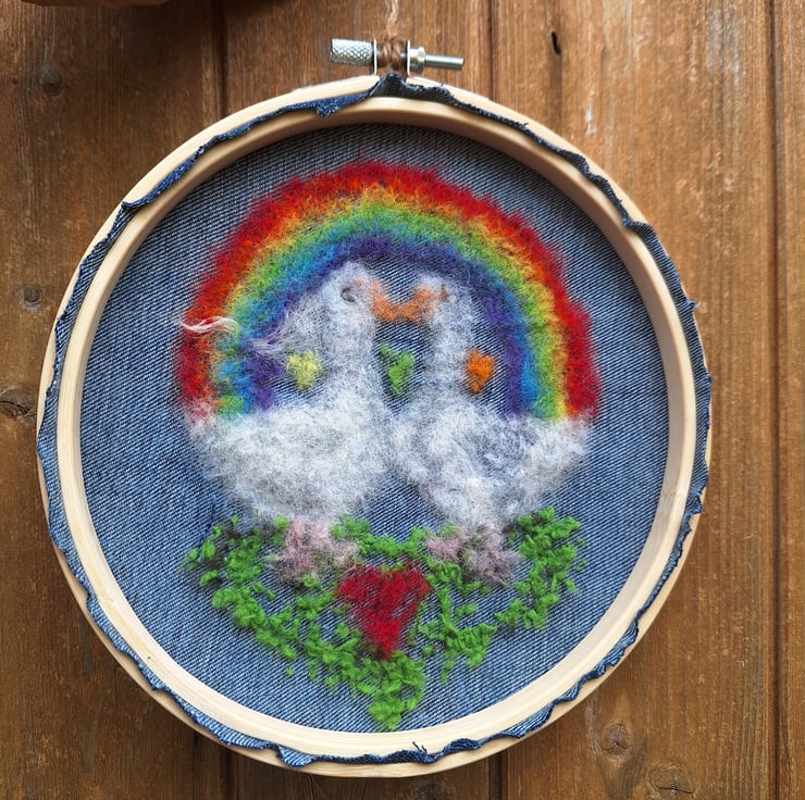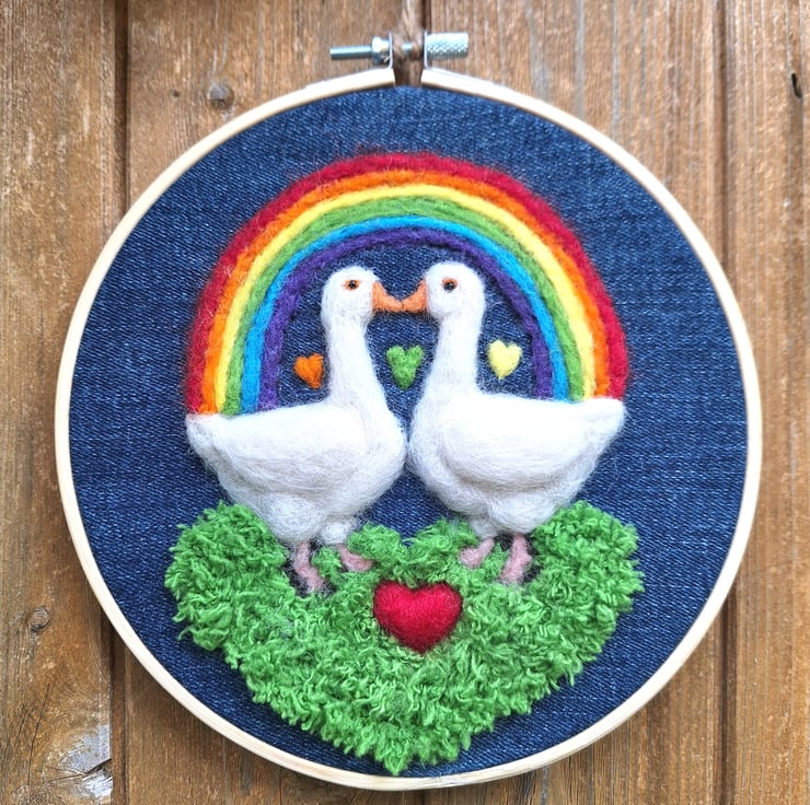 Needle-Felted Lovey-Dovey Geese Under a Rainbow (LGBT), 7 inch - Free Postage