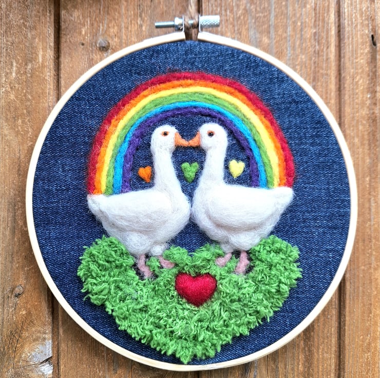 Bring a little joy, colour, and tenderness into your home with this one-of-a-kind needle-felted artwork featuring two lovey-dovey geese standing together on a heart-shaped patch of grass beneath a vibrant rainbow.