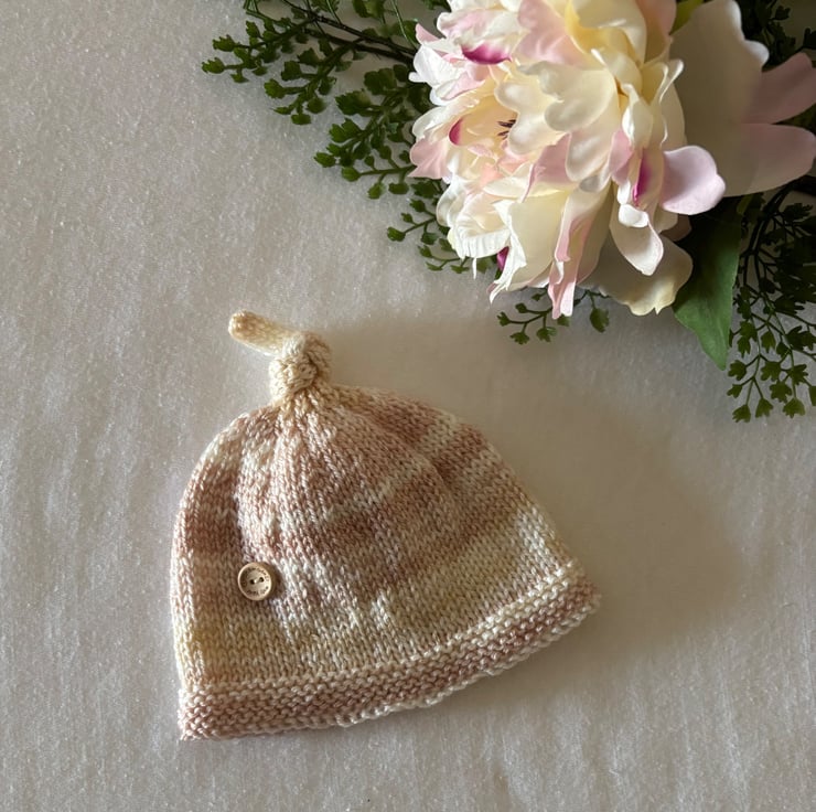 Made in soft yarn with neutral/beige/peach tones