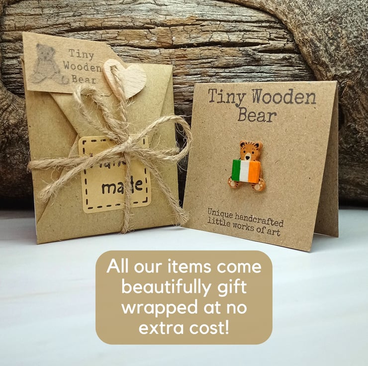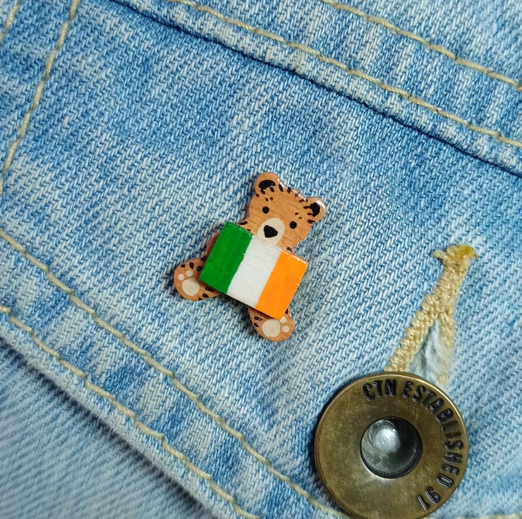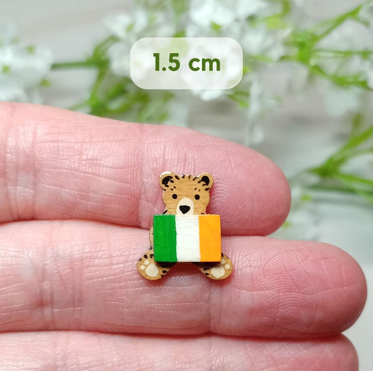 This handmade tiny Ireland flag bear brooch is a hand painted Irish bear pin, perfect as an Irish gift, keepsake or collectable. Carefully crafted from wood and painted in fine detail, it captures a charming sense of character in a beautifully small design, ideal for anyone proud of their Irish roots.