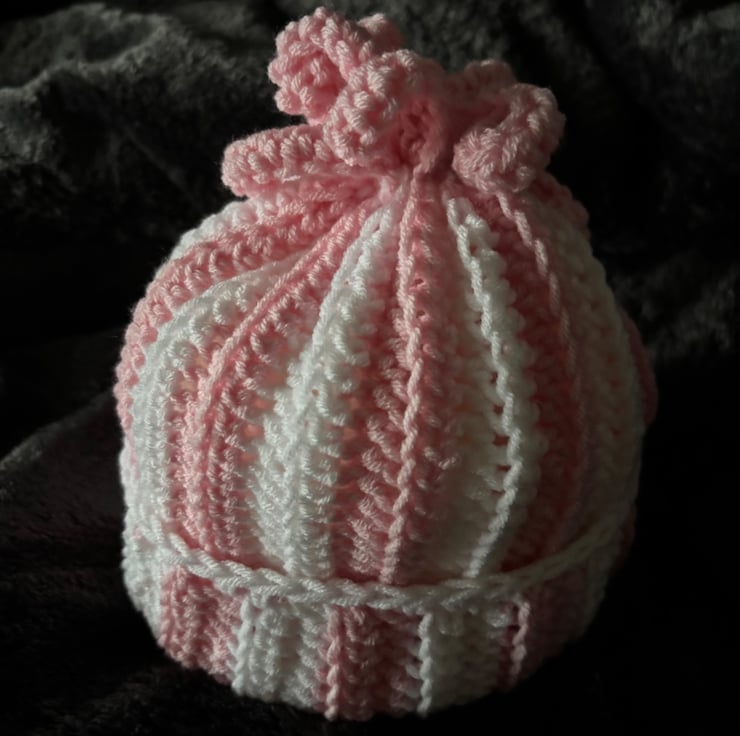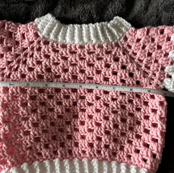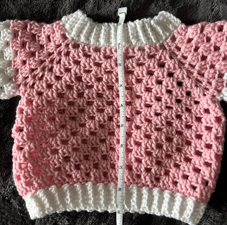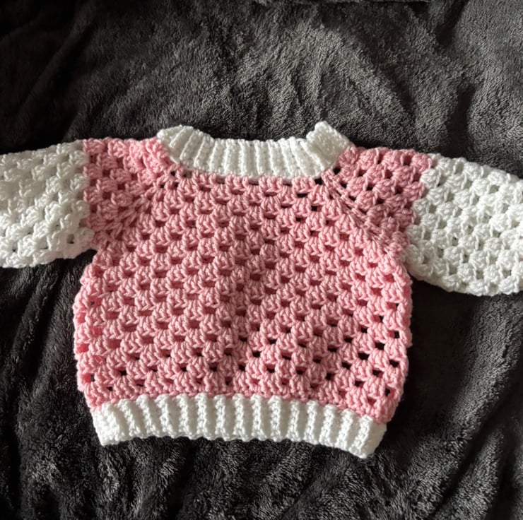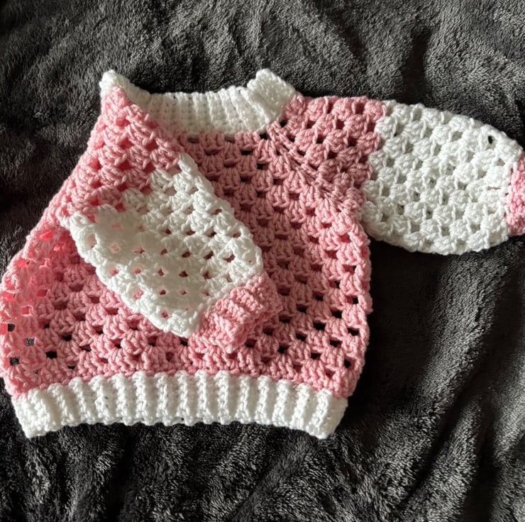 Beautiful handmade crochet jumper in a soft pink and white colour combination