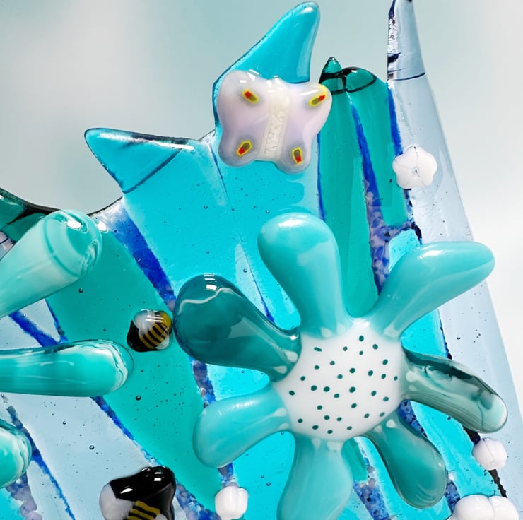 Decorated with an abundance of flowers, some of which have been cut, painted and fired beforehand. Nature is in abundance on this piece, look out for butterflies, bees and bugs.