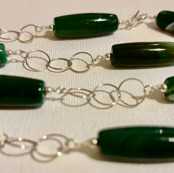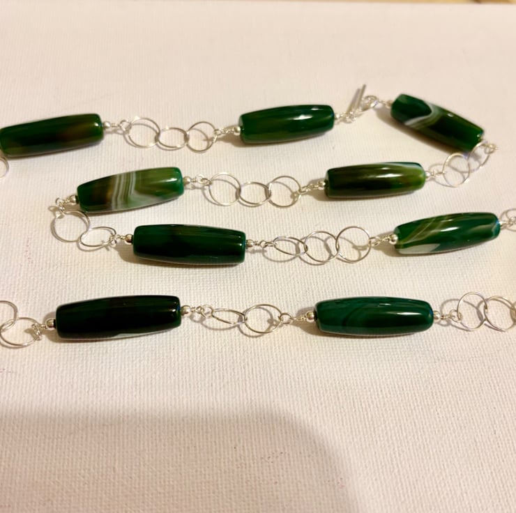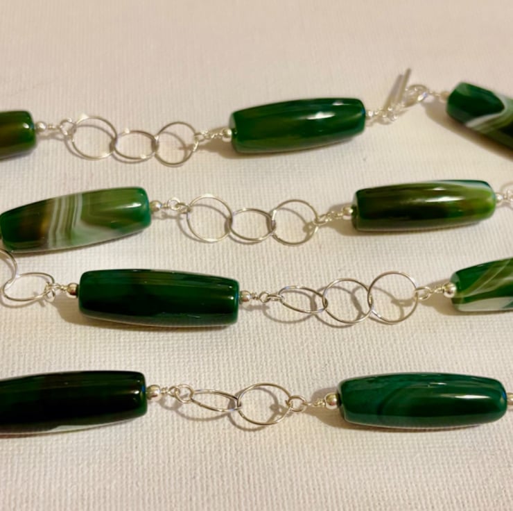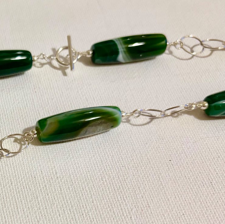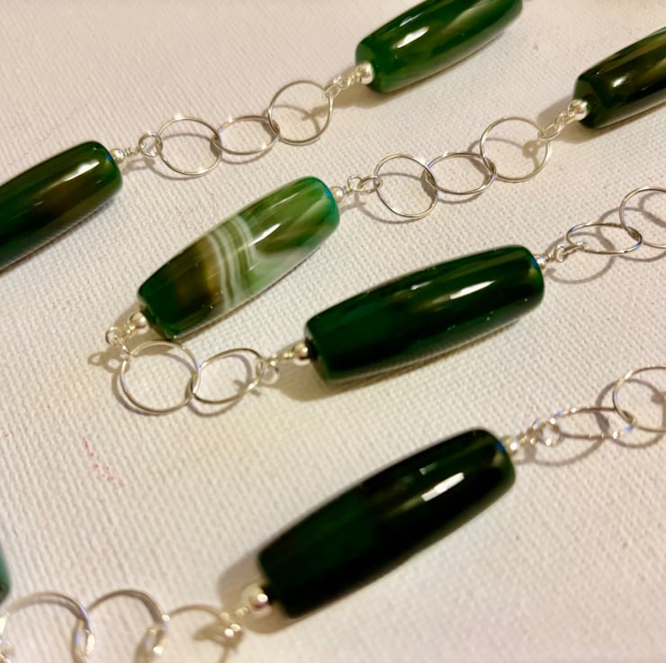 The semi precious beads in this necklace are long barrel green banded agate, and measure 3cms in length. There are little sterling silver beads either side. I then wire wrapped them to the chain links using sterling silver wire.