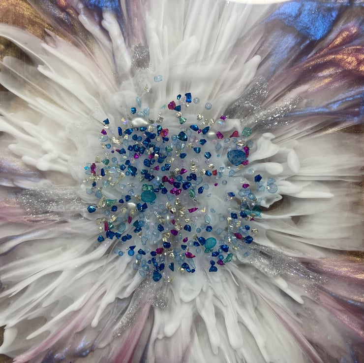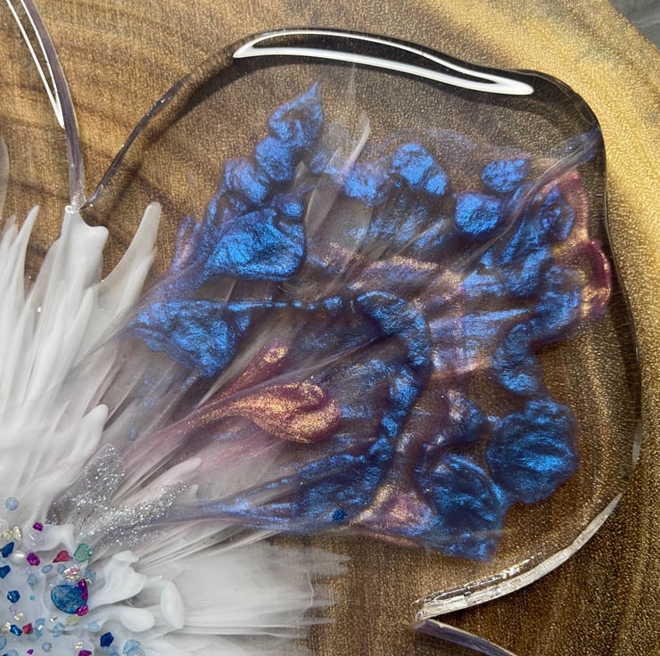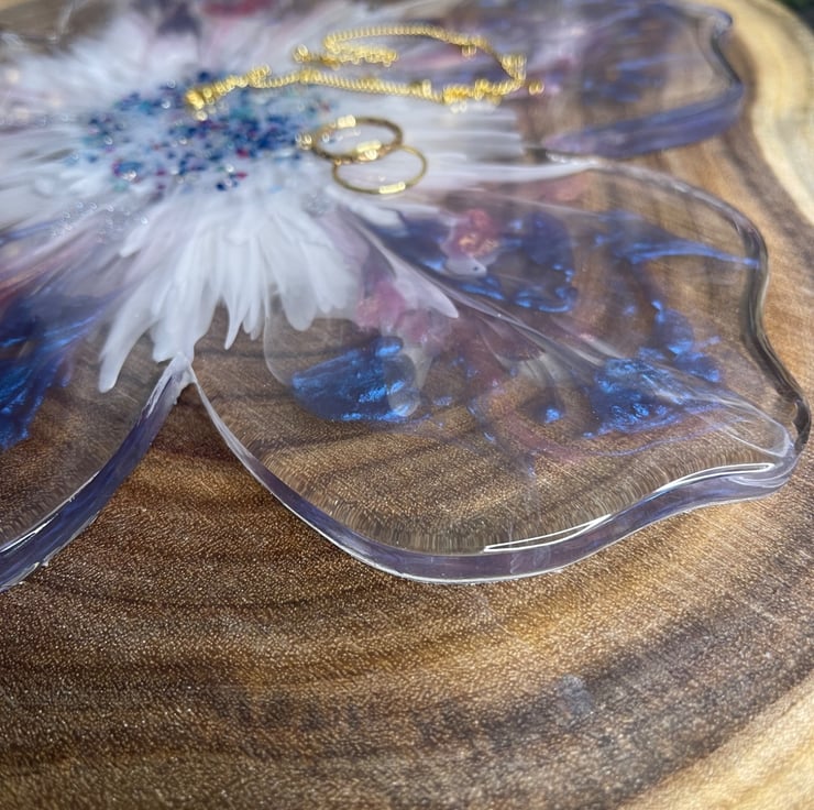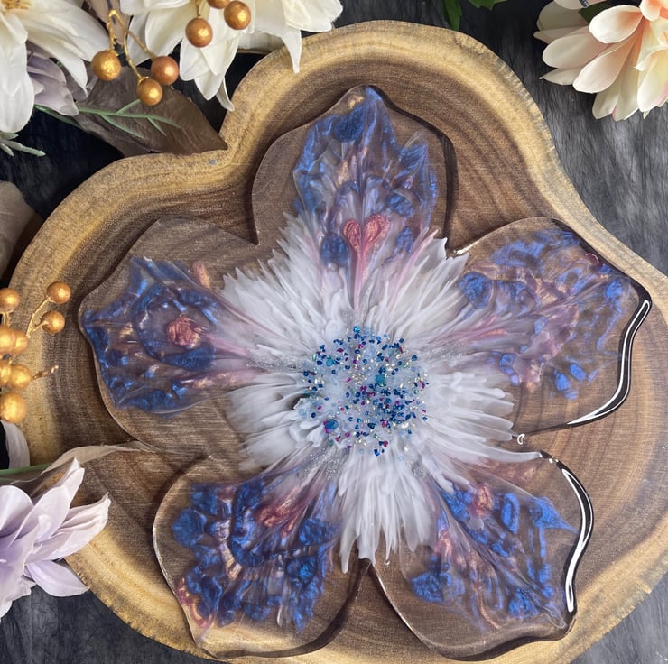 A unique handmade resin coaster inspired by nature beauty of blooming flowers. Designed in a delicate floral shape. This piece blends white, deep blue, and violet tones to create an elegant abstract bloom.