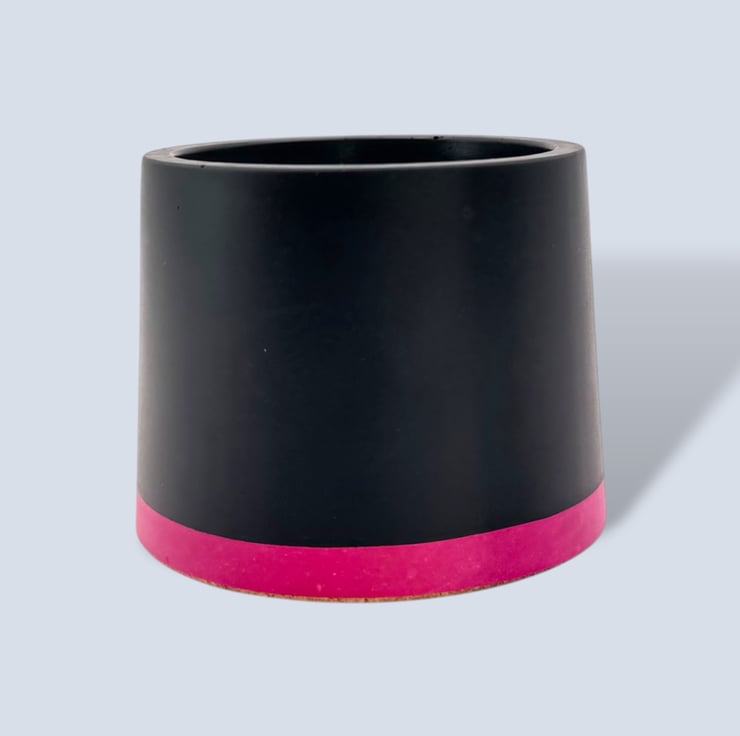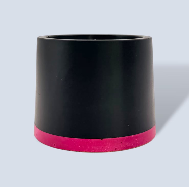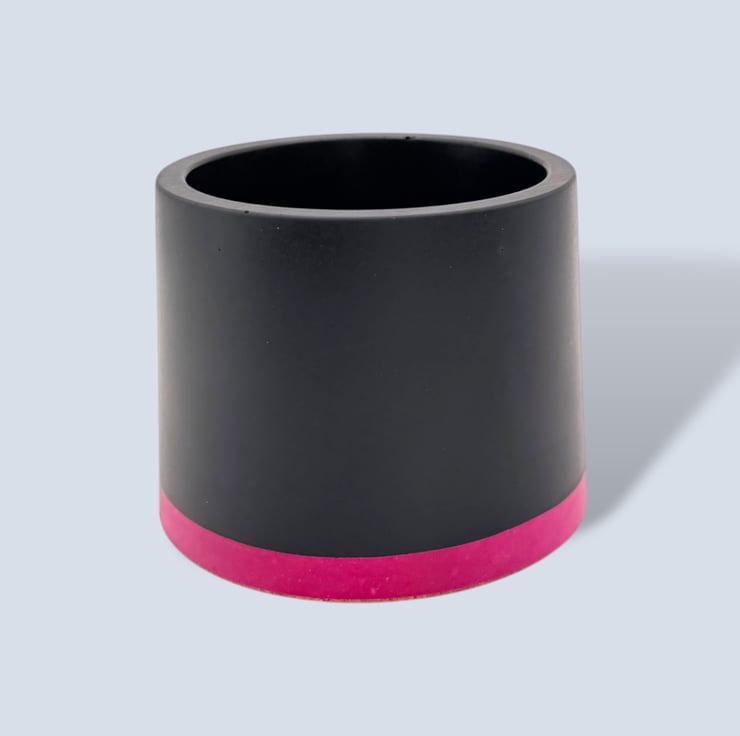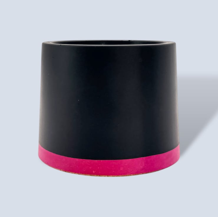 Small 7.5 cm round black and fuchsia pink plant pot, indoor planter and decorative houseplant pot for small houseplants, succulents, cacti and cuttings. This handmade two tone planter features a smooth black upper section with a vivid fuchsia pink band around the base, creating a bold colour block design that brings colour, contrast and visual interest to shelves, desks, side tables, windowsills and indoor plant displays, making it a lovely gift for plant lovers, housewarmings or birthdays. Its gently tapered shape and modern two tone finish give it a distinctive decorative look that works beautifully in contemporary interiors, colourful homes, eclectic decor and cosy indoor spaces.