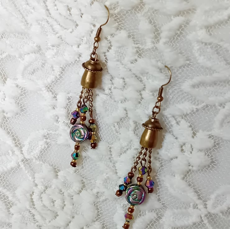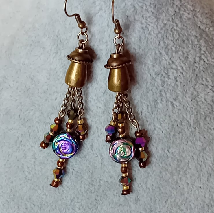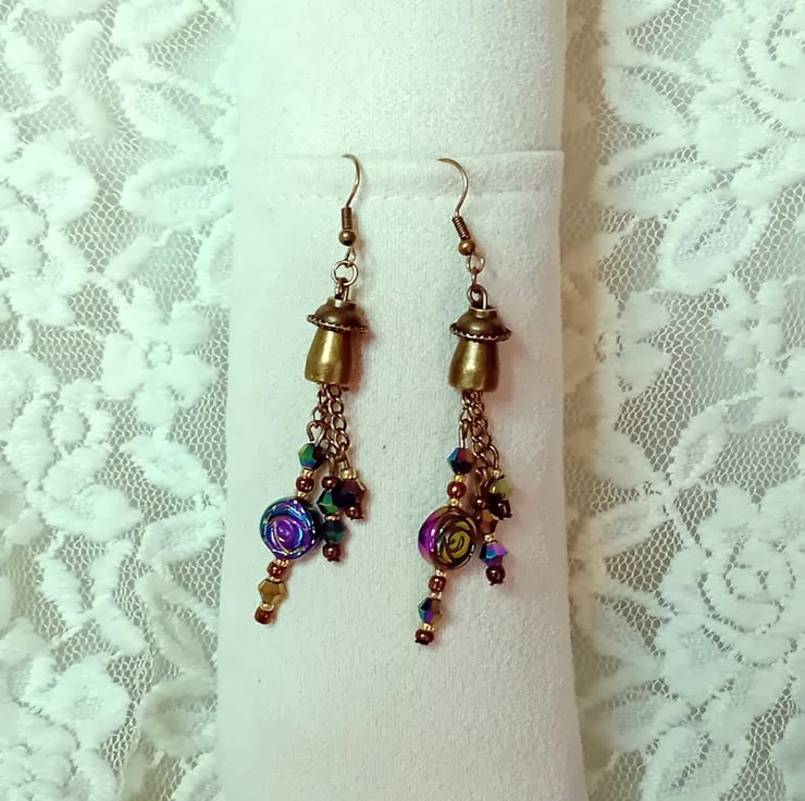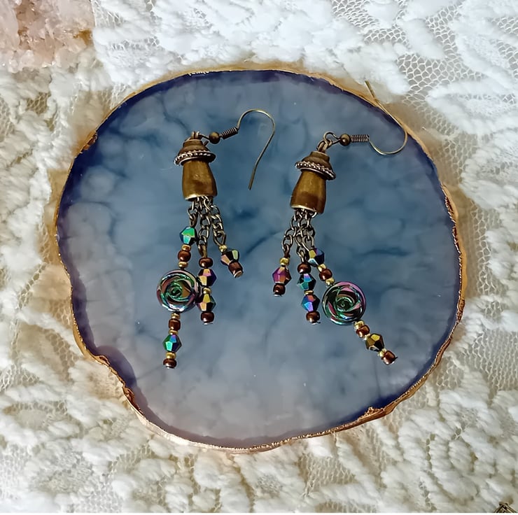 Elevate your jewelry collection with these stunning aura-colored glass beads, beautifully paired with elegant bronze accents. Featuring a graceful 5.5cm (2 1/4 inch) drop, these pieces showcase a mesmerizing iridescent finish that shifts through a vibrant spectrum of purple, green, gold, and blue as they catch the light.