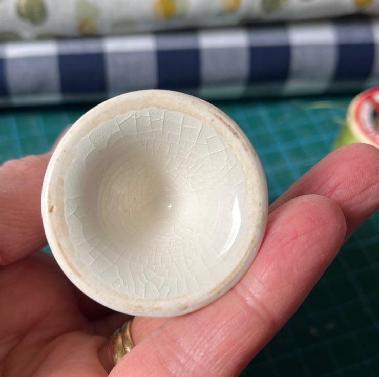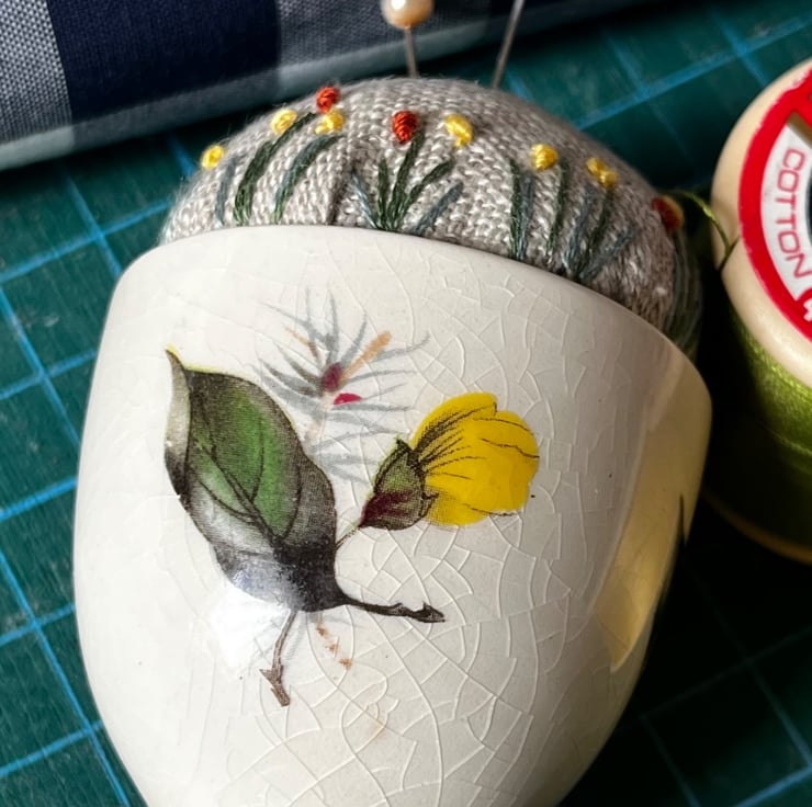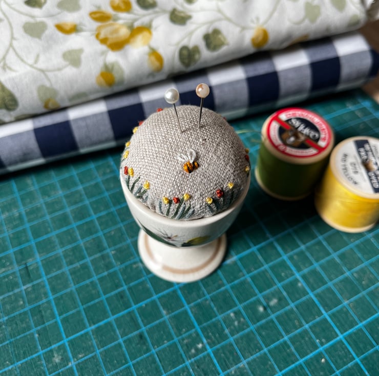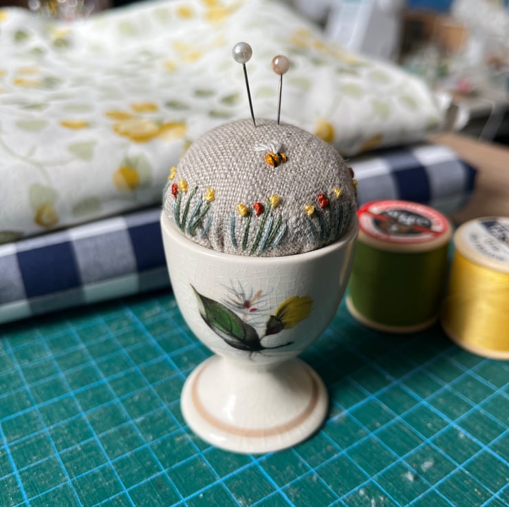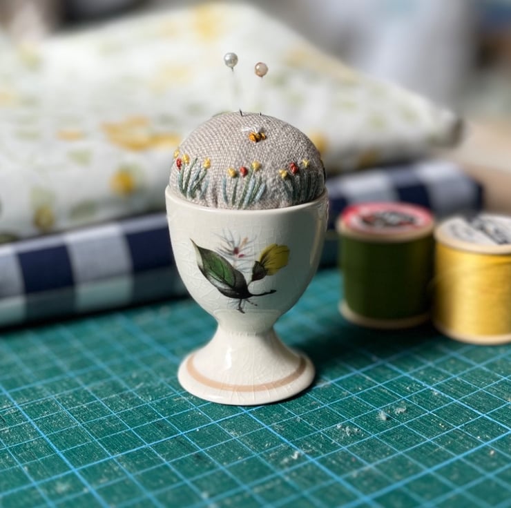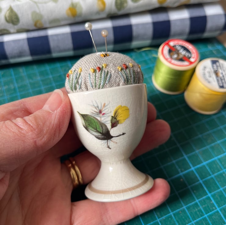 Cute embroidered pincushion in a vintage egg cup with a repeated rose bud design. The reclaimed linen cushion has been embroidered with tiny flowers and a bee.