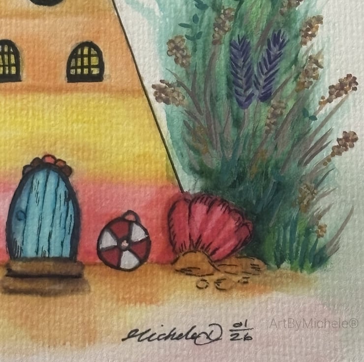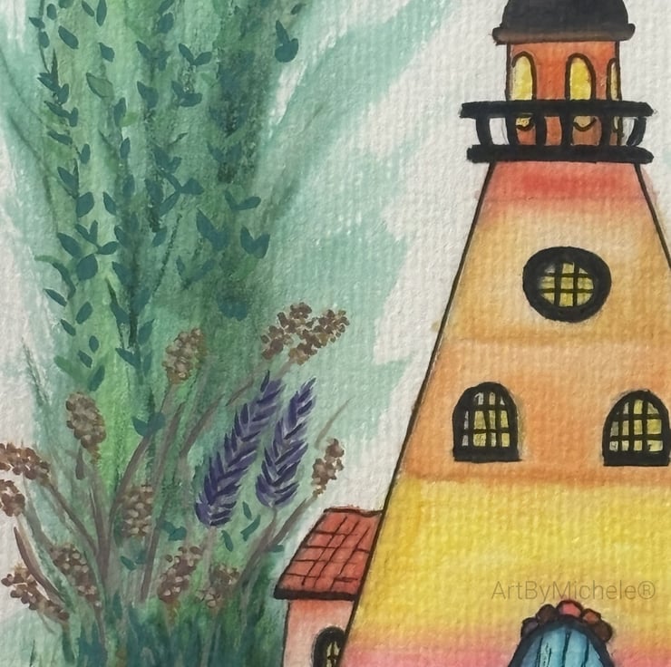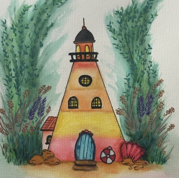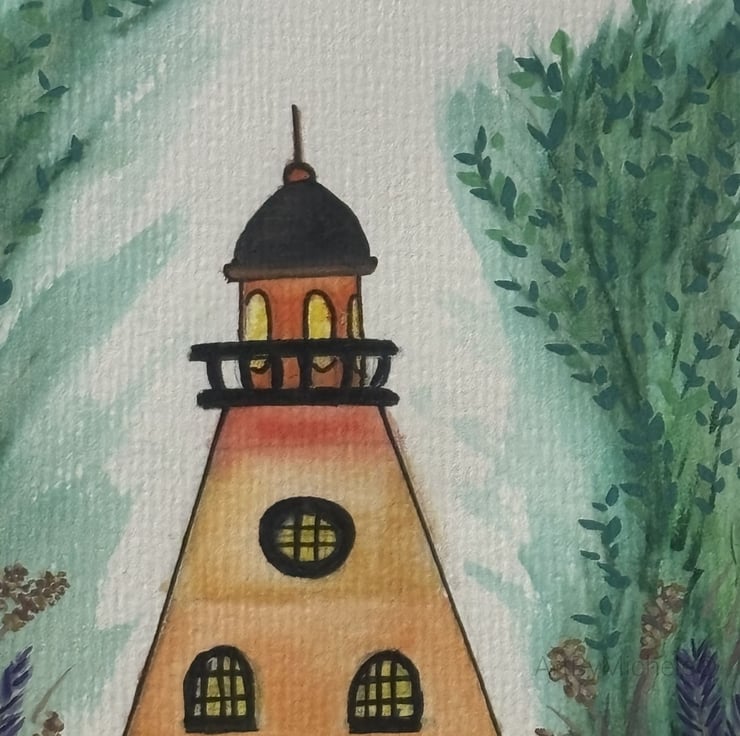 Here is my original whimsy artwork of a lighthouse, inspired by the colourful sands of The Isle of Wight. The lighthouse is hugged by the waves of the ocean, wispy reeds and flowers of the land.