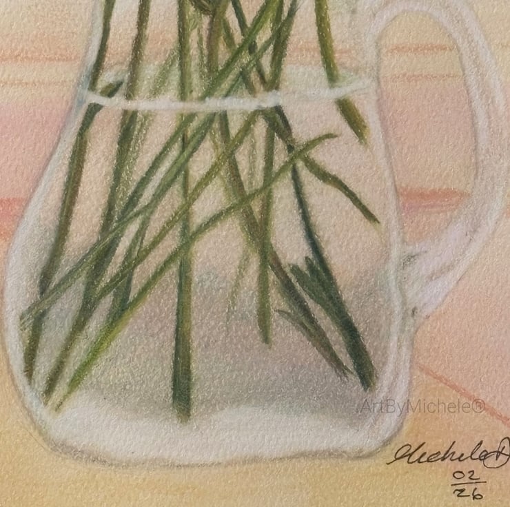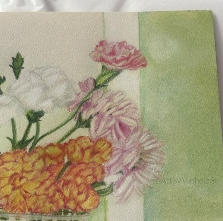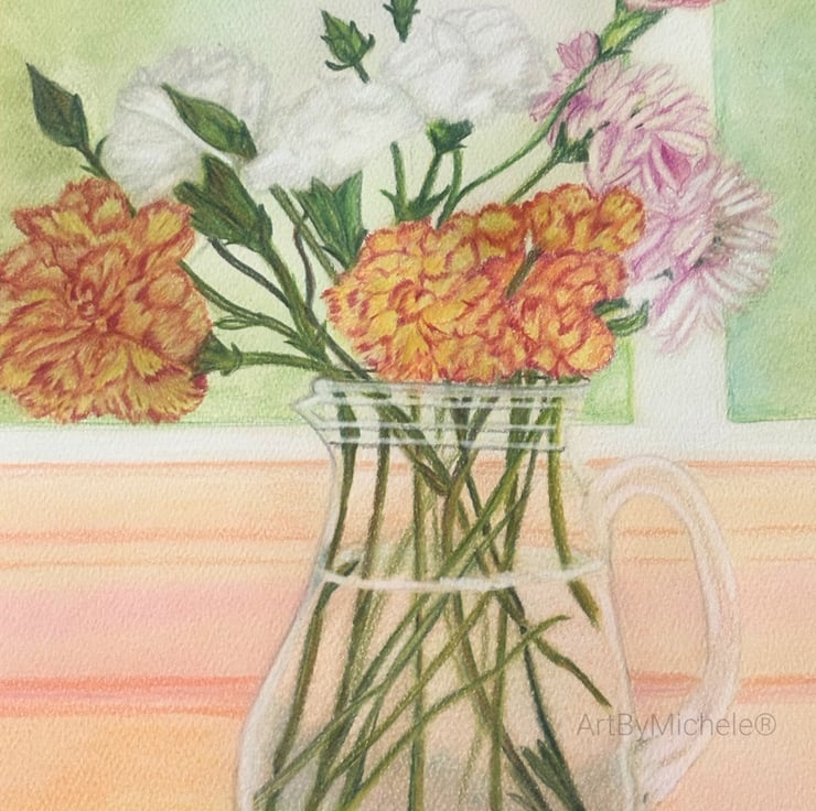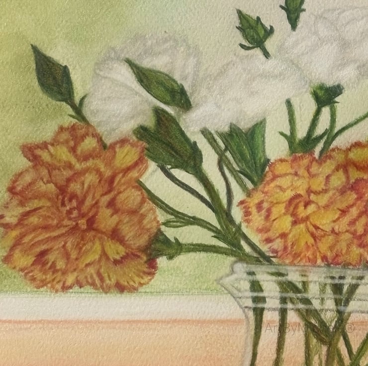 Flowers in bloom, original artwork, mixed media of colour pencils and pastels.