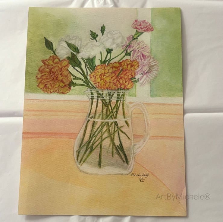Inspired by springtime flowers in bloom, set in a soft palette of pastel colours. Subject of a glass jug with a spring flower bouquet, absorbing the warm hazy rays through the window.