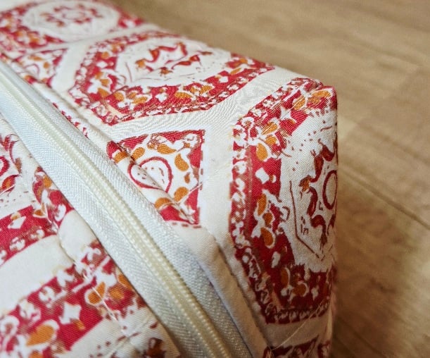 This boxed pouch was handmade using cotton fabric in red and cream patterns. The pouch has a pink waterproof lining. It is also lined with interfacing and fleece to give it structure, strength and a padded feel so that it will stand when empty. It features a cream zip and grab handles on both sides.