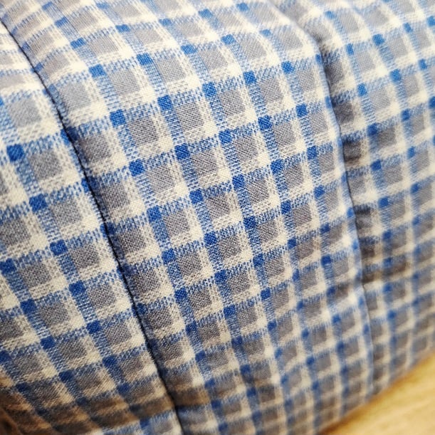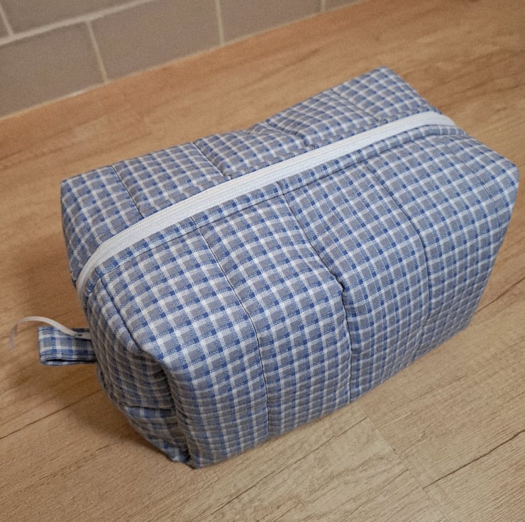 This boxed pouch was handmade using a checked cotton fabric in blue and white. The pouch has a white waterproof lining. It is also lined with interfacing and fleece to give it structure, strength and a padded feel so that it will stand when empty. It features a white zip and grab handles on both sides.