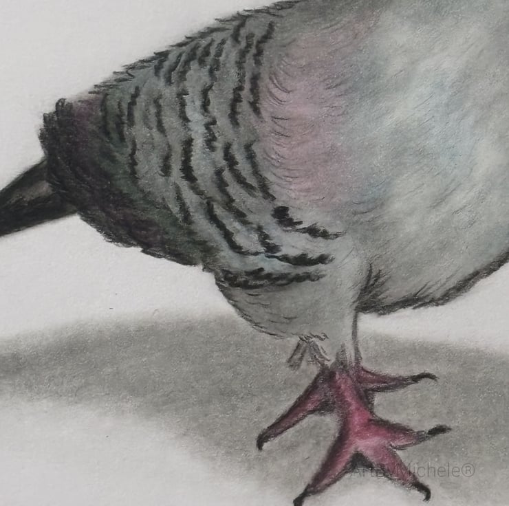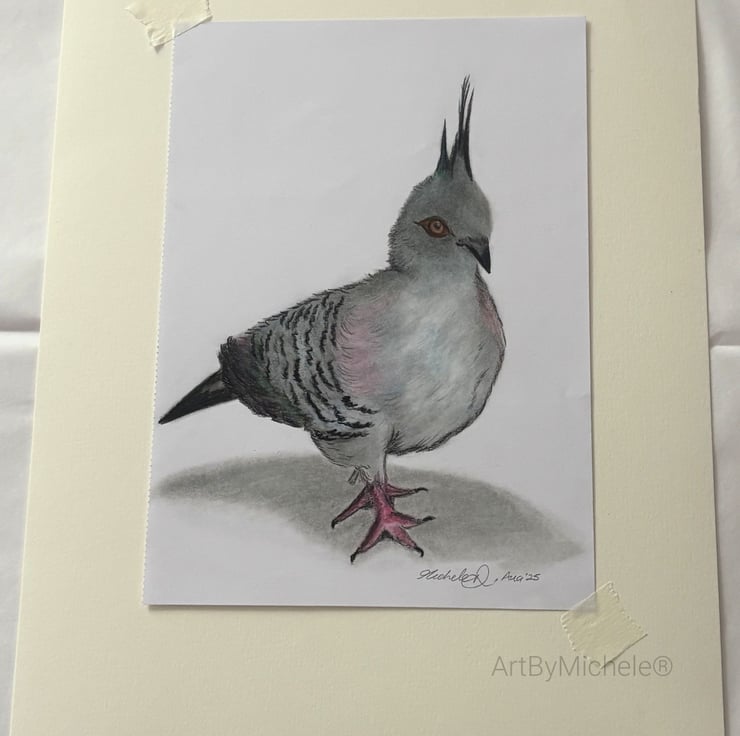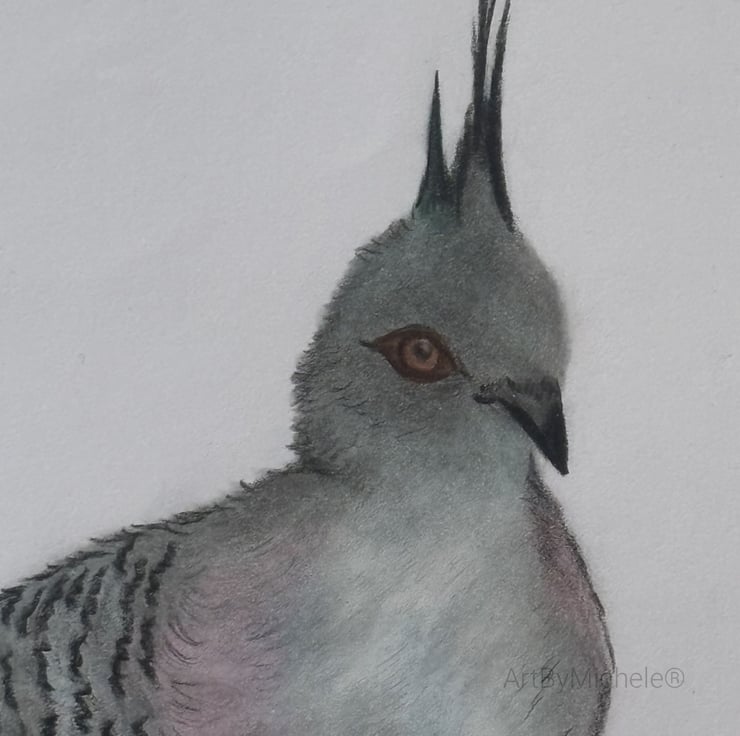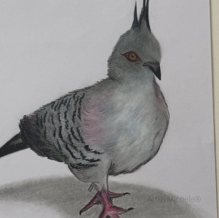 Crested pigeon drawing, created using colour pencils. A native bird to Australia.