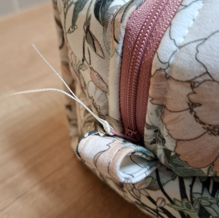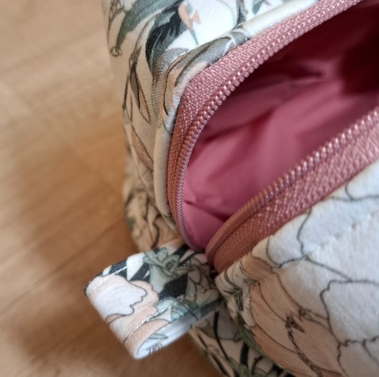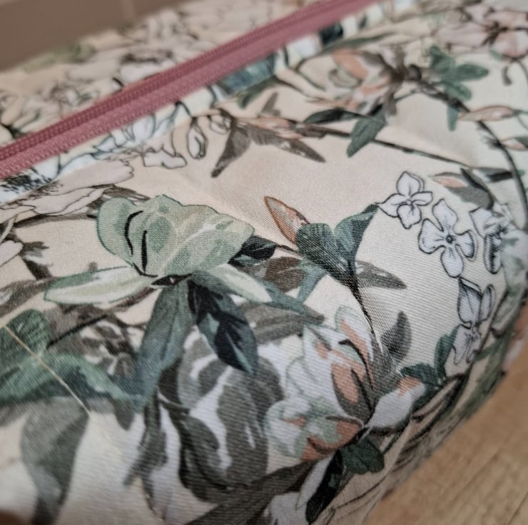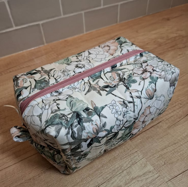 This boxed pouch was handmade using an upholstery type fabric in lovely colours of pink, green and cream. The pouch has a pink waterproof lining. It is also lined with interfacing and fleece to give it structure, strength and a padded feel so that it will stand when empty. It features a pink zip and grab handles on both sides.