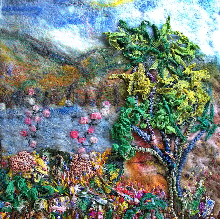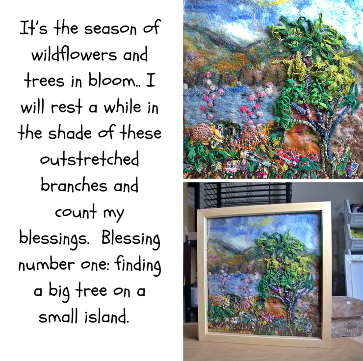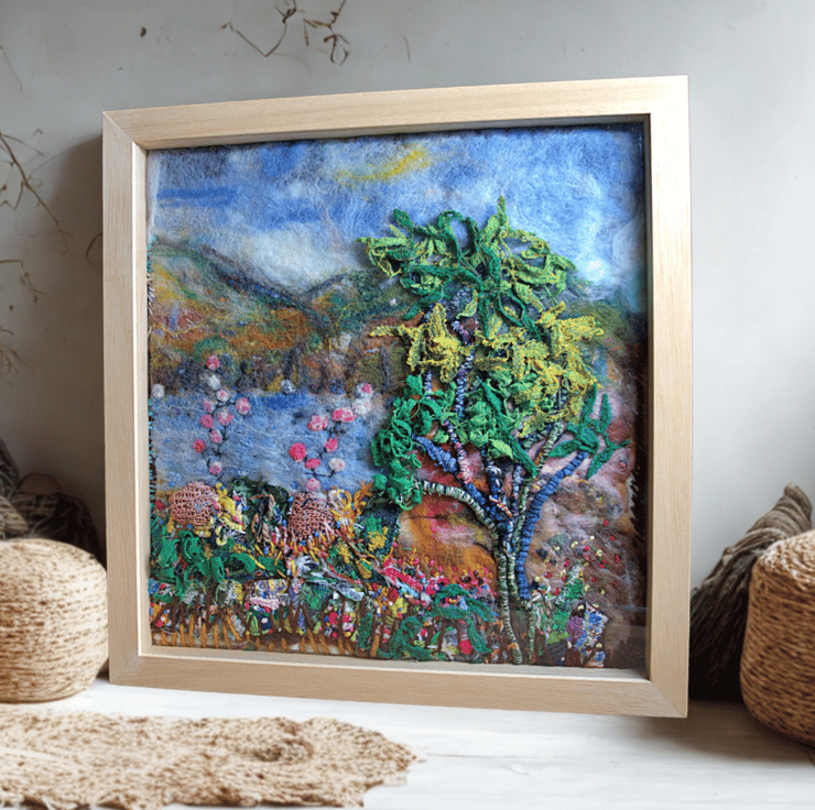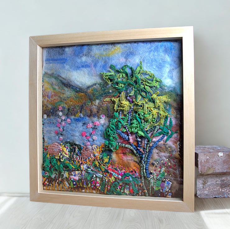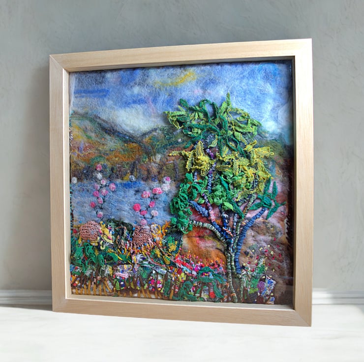 This is an original textile landscape. The scene incorporates tiny pieces of silk embedded into felt and fibres. I've then stitched over the top using a variety of natural yarns. It features a large tree stretching high to the sky surrounded by grasses and small wildflowers.