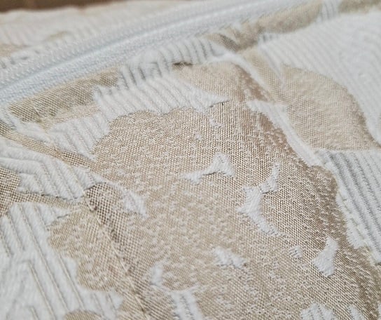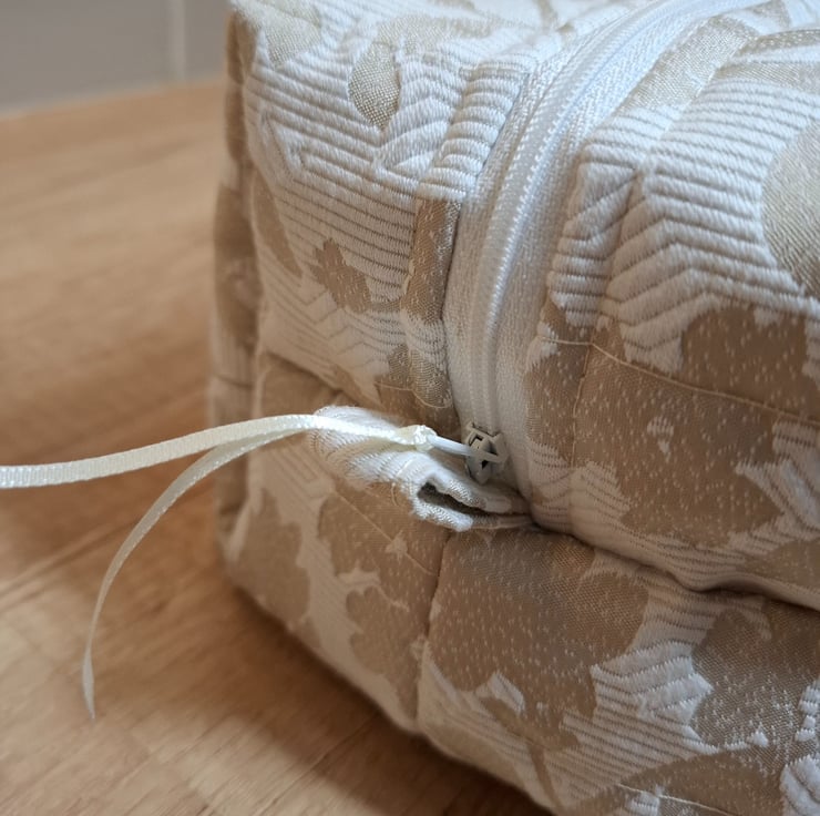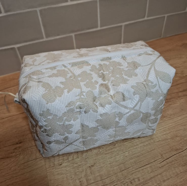 This boxed pouch was handmade using an upholstery type fabric in lovely colours of beige and creamy-white. The pouch has a white waterproof lining. It is also lined with interfacing and fleece to give it structure, strength and a padded feel so that it will stand when empty. It features a cream zip and grab handles on both sides.