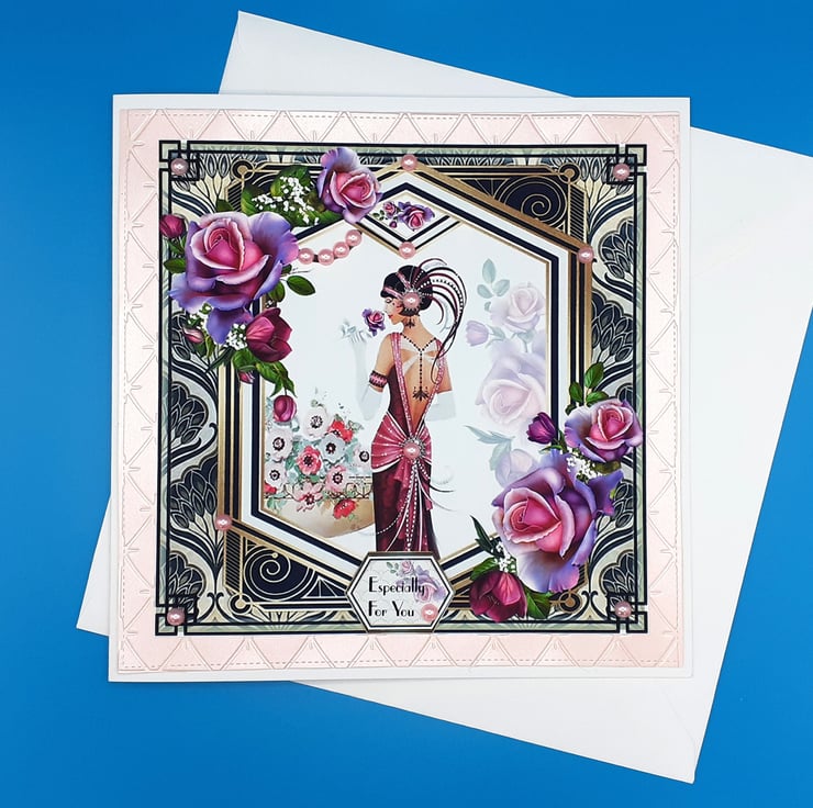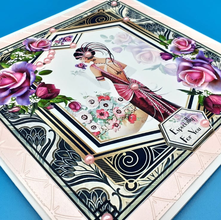 The main design is of a lady dressed in art deco style dress in a shade of pink with pretty pink pearl coloured acrylic stones